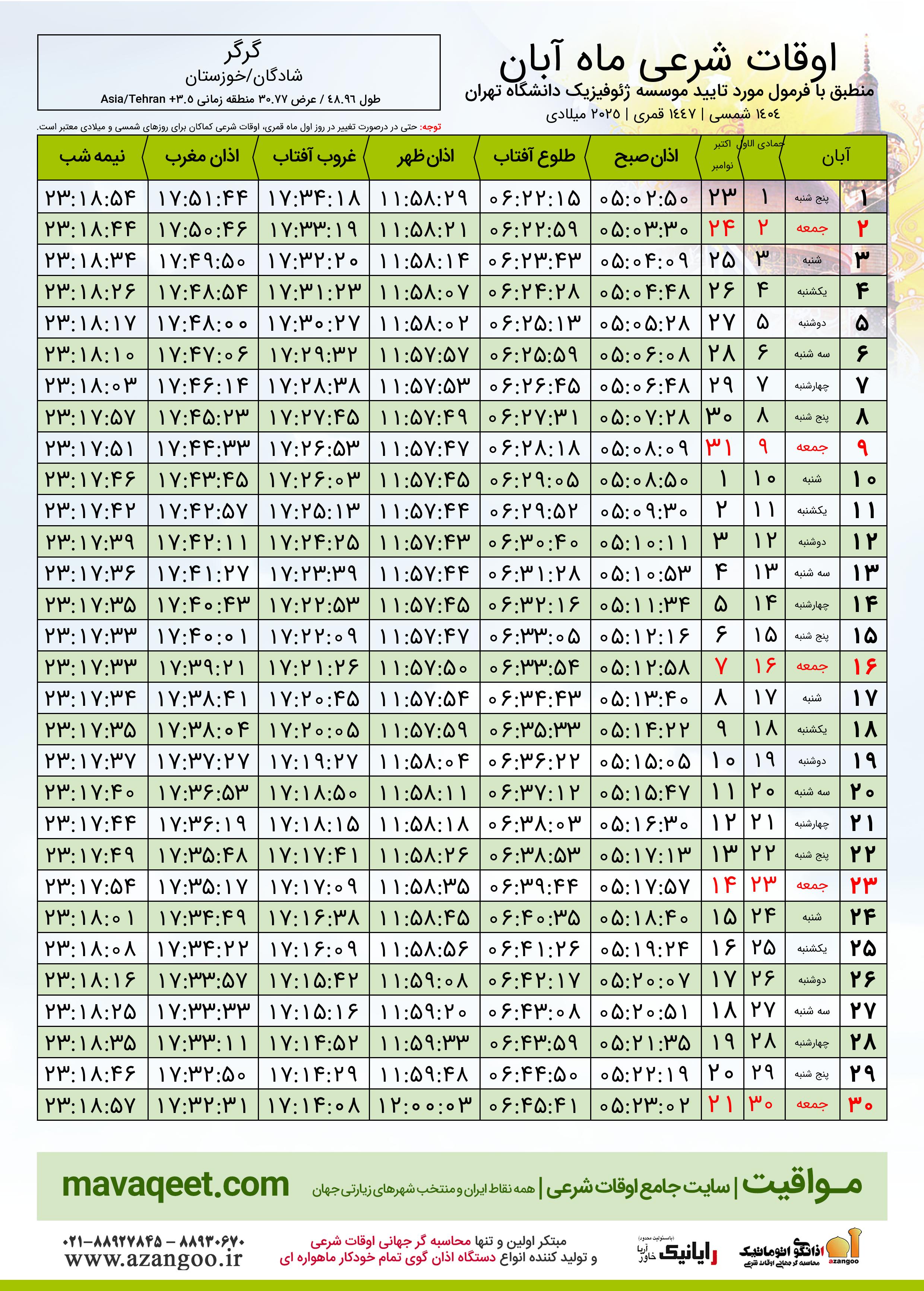جدول اوقات شرعی آبان ١٤٠٤ شمسی شهر گرگر