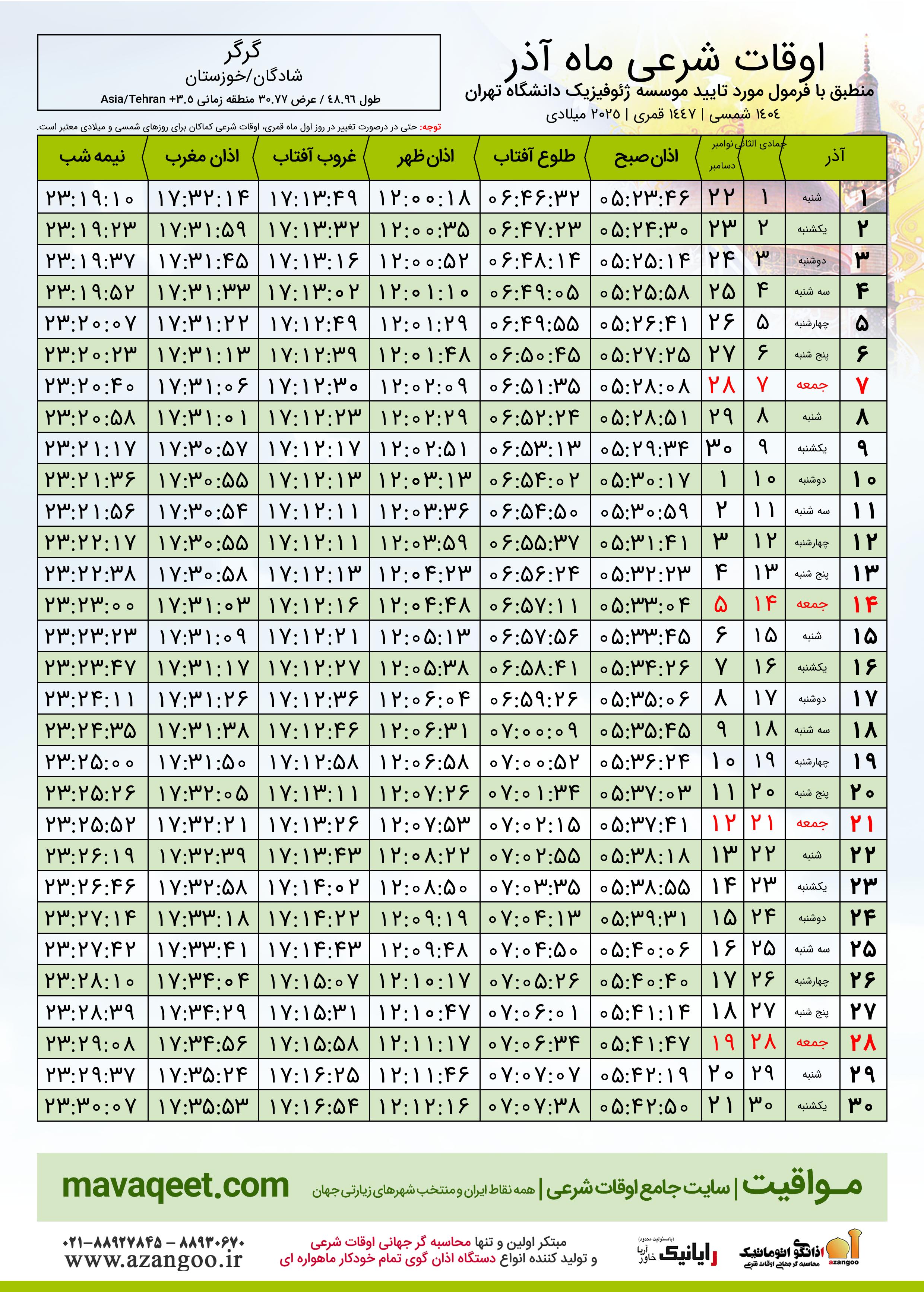جدول اوقات شرعی آذر ١٤٠٤ شمسی شهر گرگر