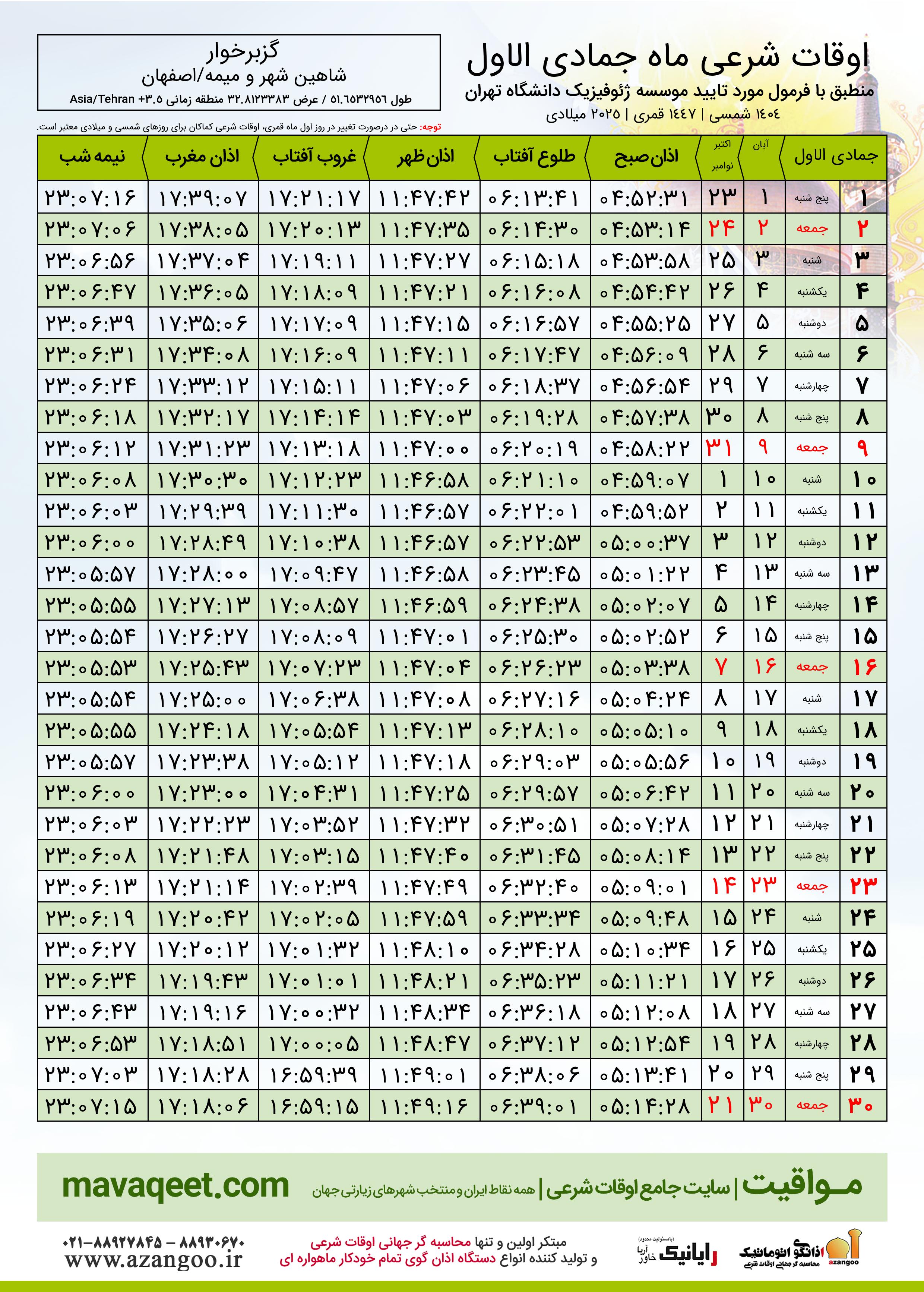 اوقات شرعی ماه جمادی الاول ١٤٤٧ هـ.ق شهر گزبرخوار بر