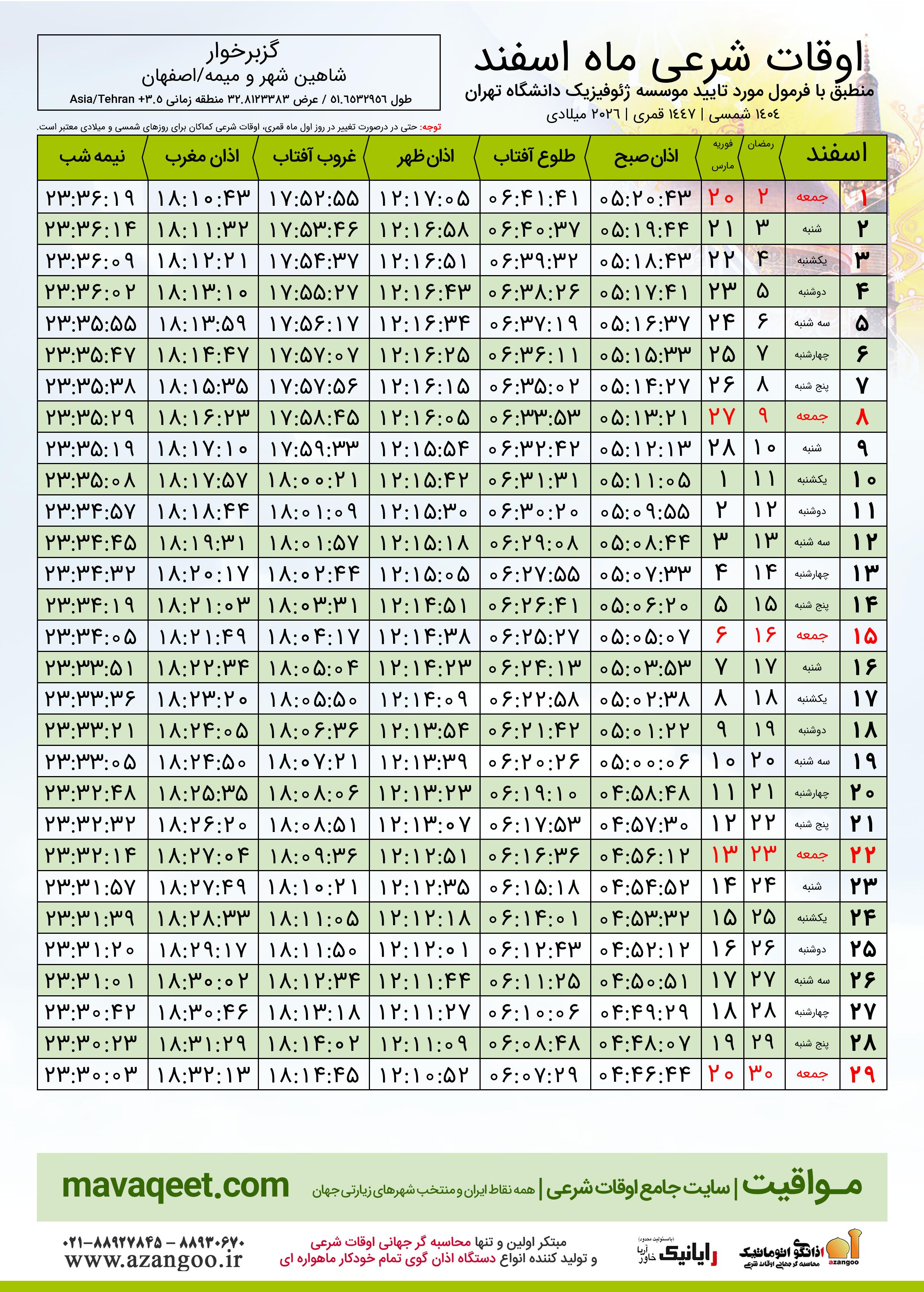 اوقات شرعی ماه رمضان شهر گزبرخوار ١٤٠٤ - ٠٤ شمسی | ٢٠٢٦ میلادی