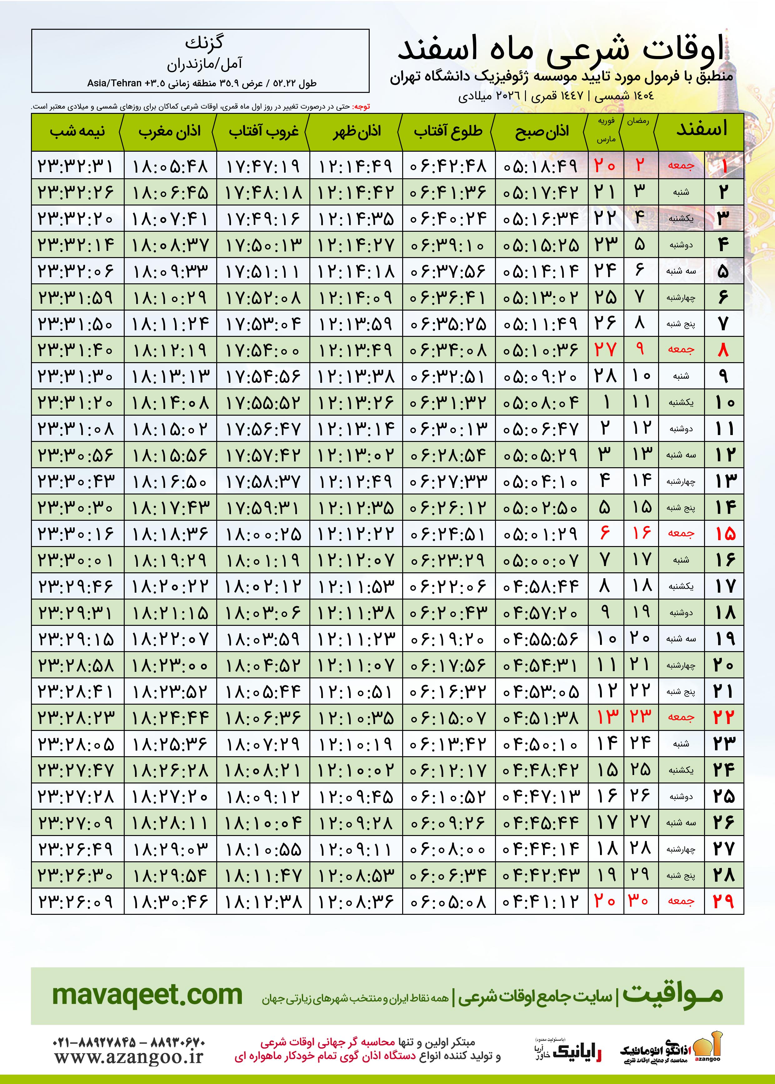 دانلود اوقات شرعی فوریه ٢٠٢٦ شهر گزنک