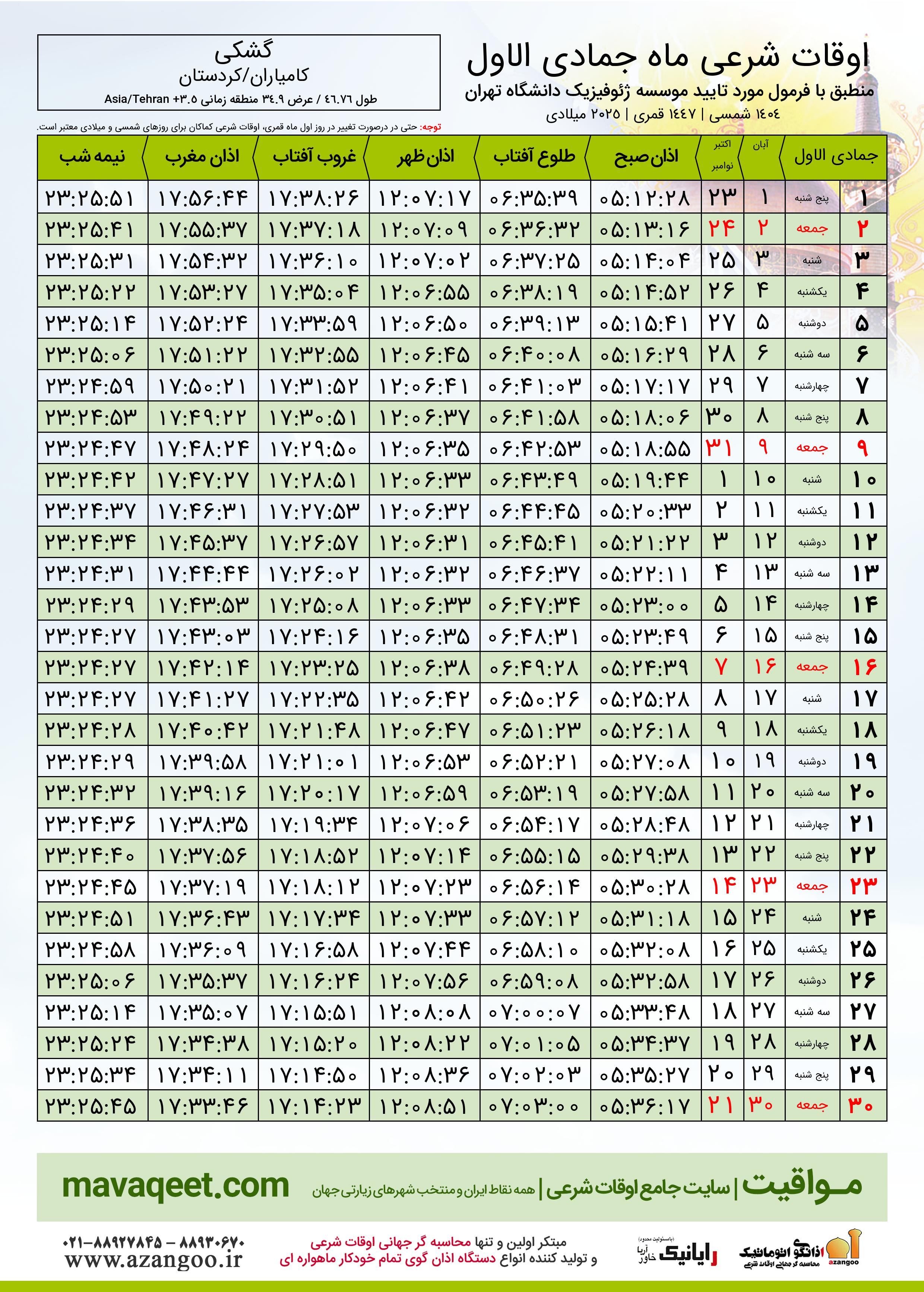 جدول اوقات شرعی جمادی الاول ١٤٤٧ قمری شهر گشکی