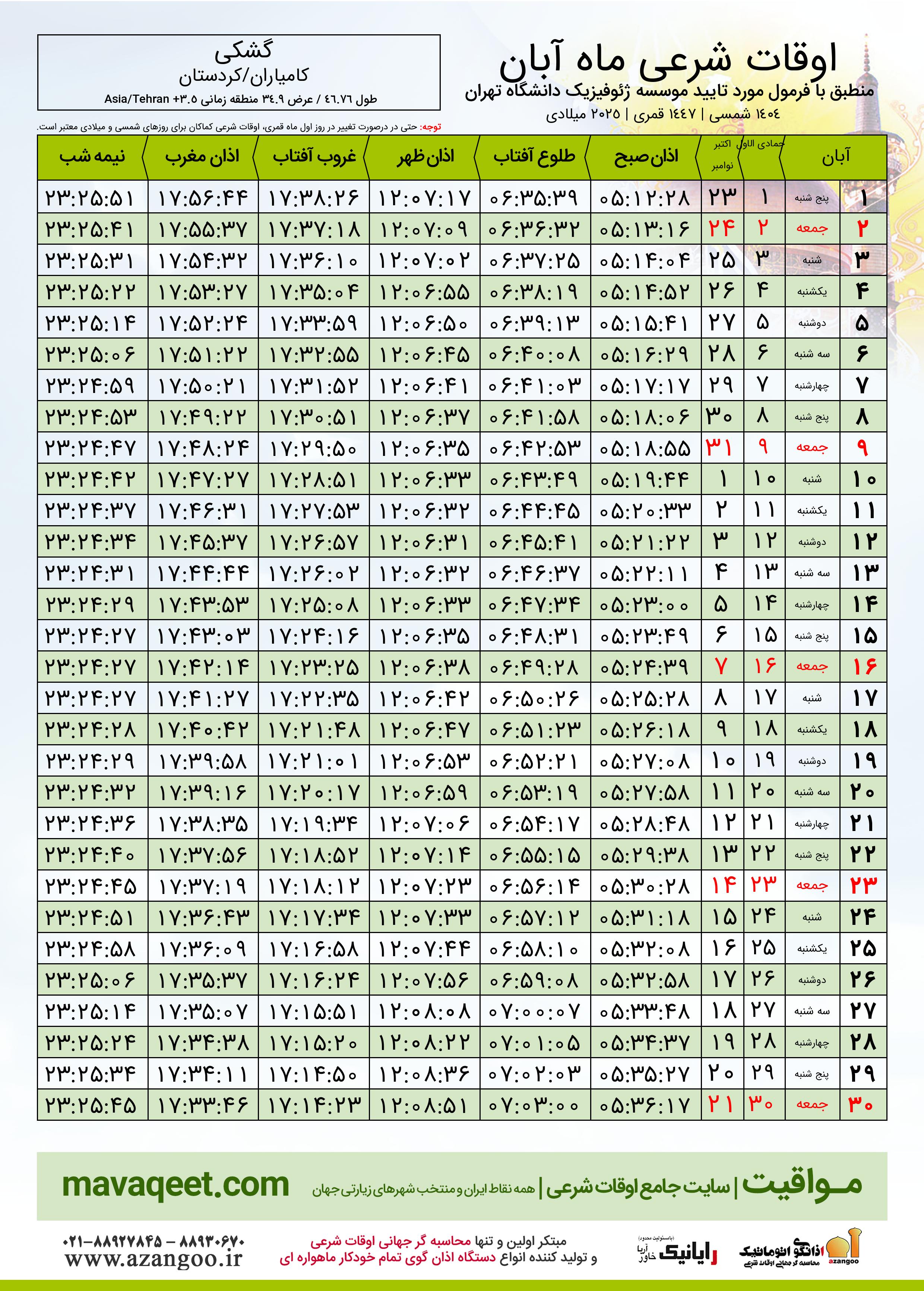 جدول اوقات شرعی آبان ١٤٠٤ شمسی شهر گشکی