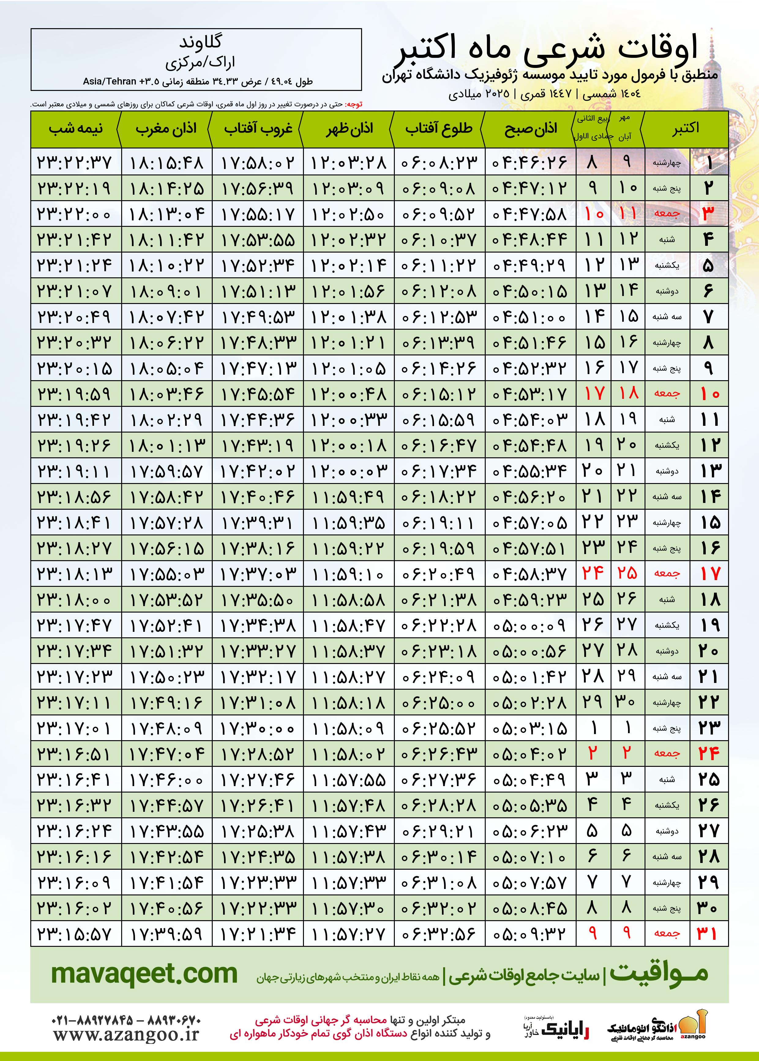 اوقات شرعی اکتبر ٢٠٢٥ میلادی شهر گلاوند