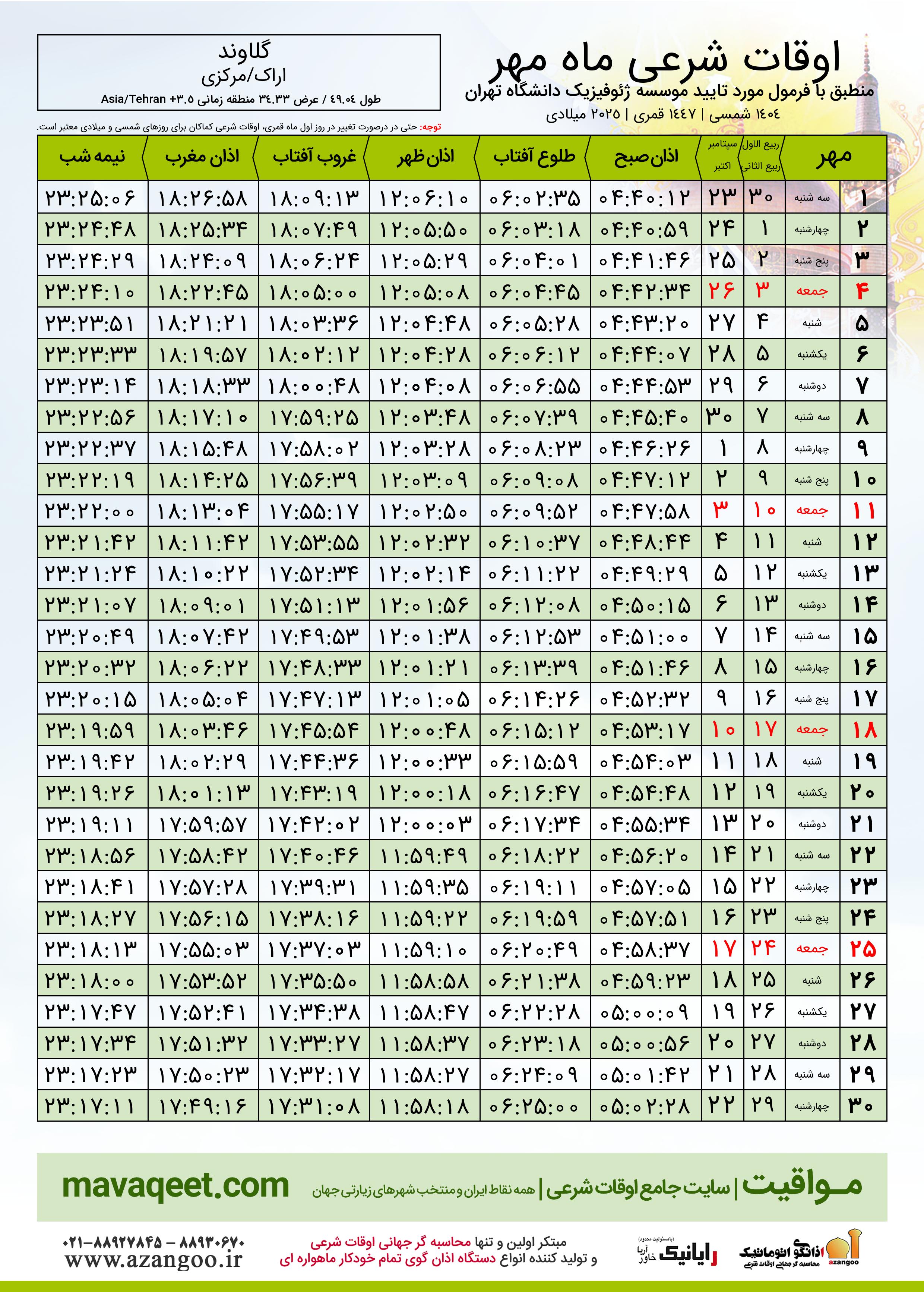 جدول اوقات شرعی مهر ١٤٠٤ شمسی شهر گلاوند