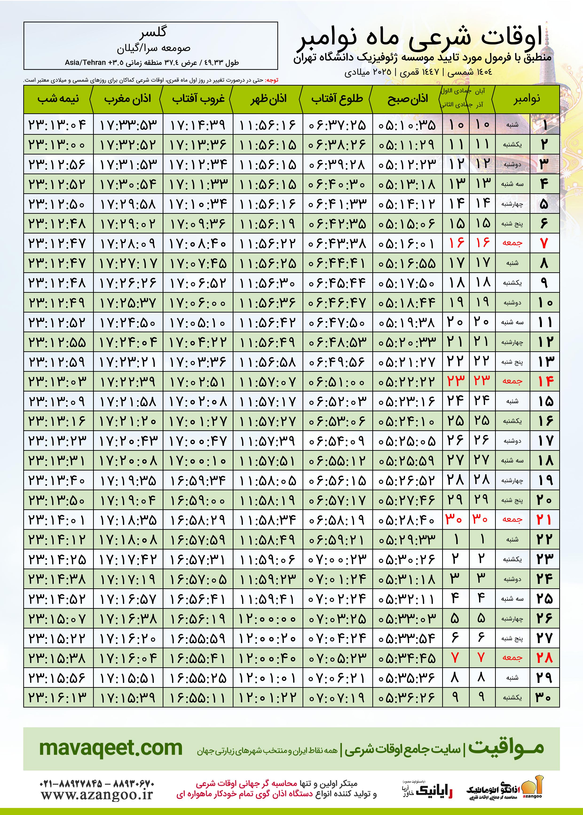 اوقات شرعی نوامبر ٢٠٢٥ میلادی شهر گلسر