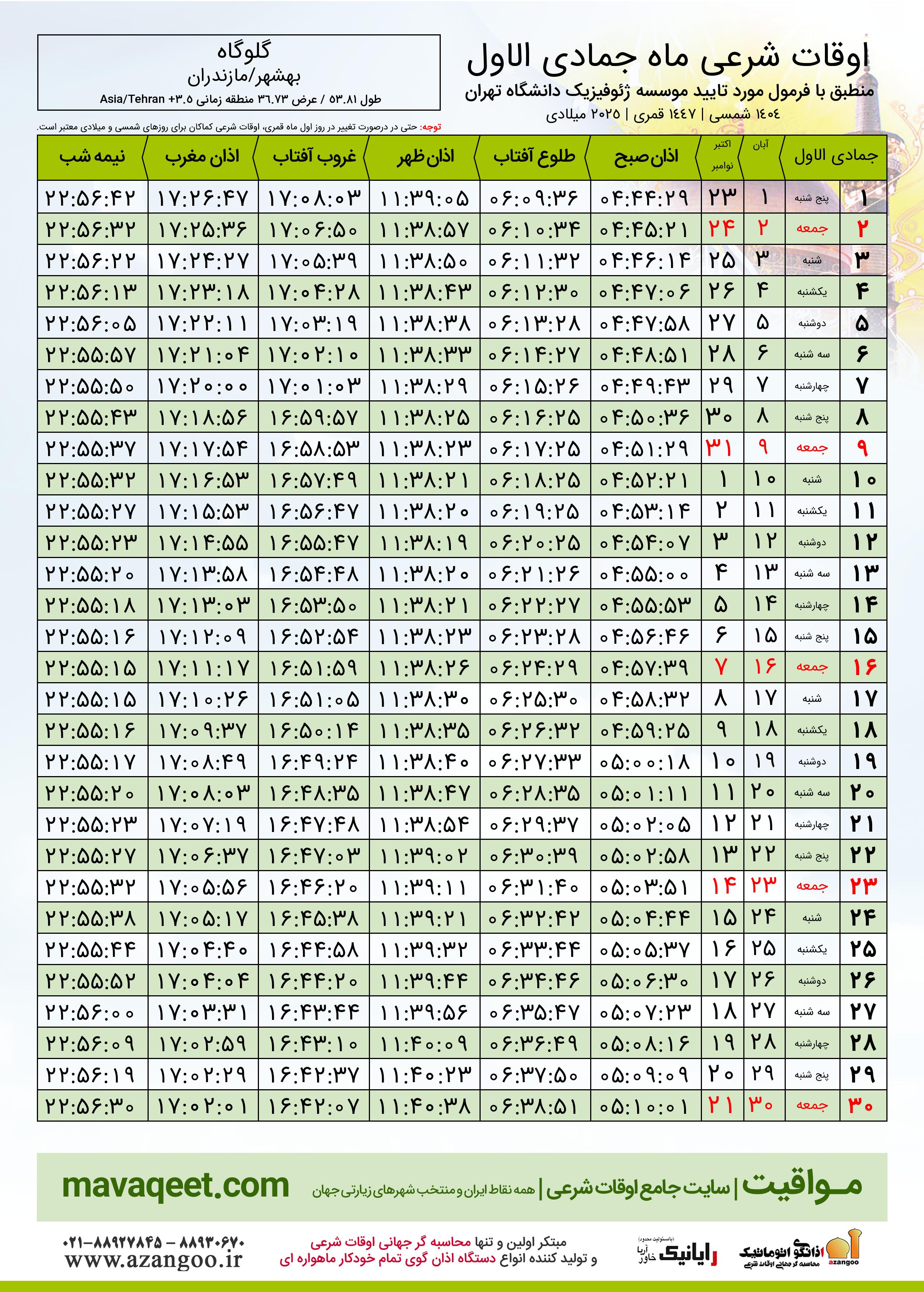 جدول اوقات شرعی جمادی الاول ١٤٤٧ قمری شهر گلوگاه