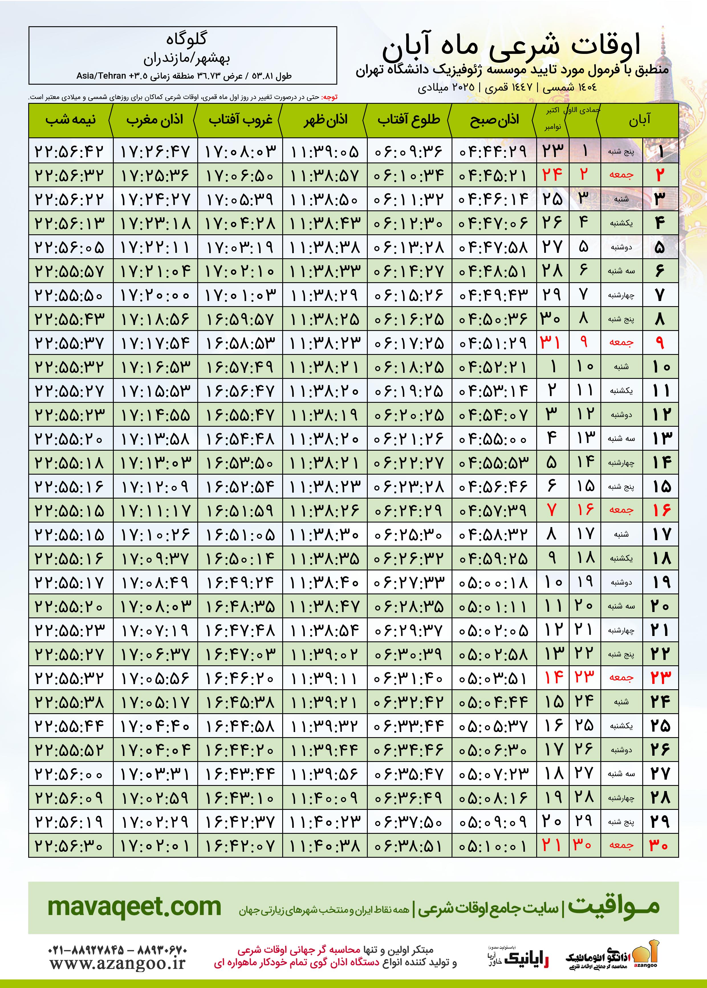 اوقات شرعی آبان ١٤٠٤ شمسی شهر گلوگاه