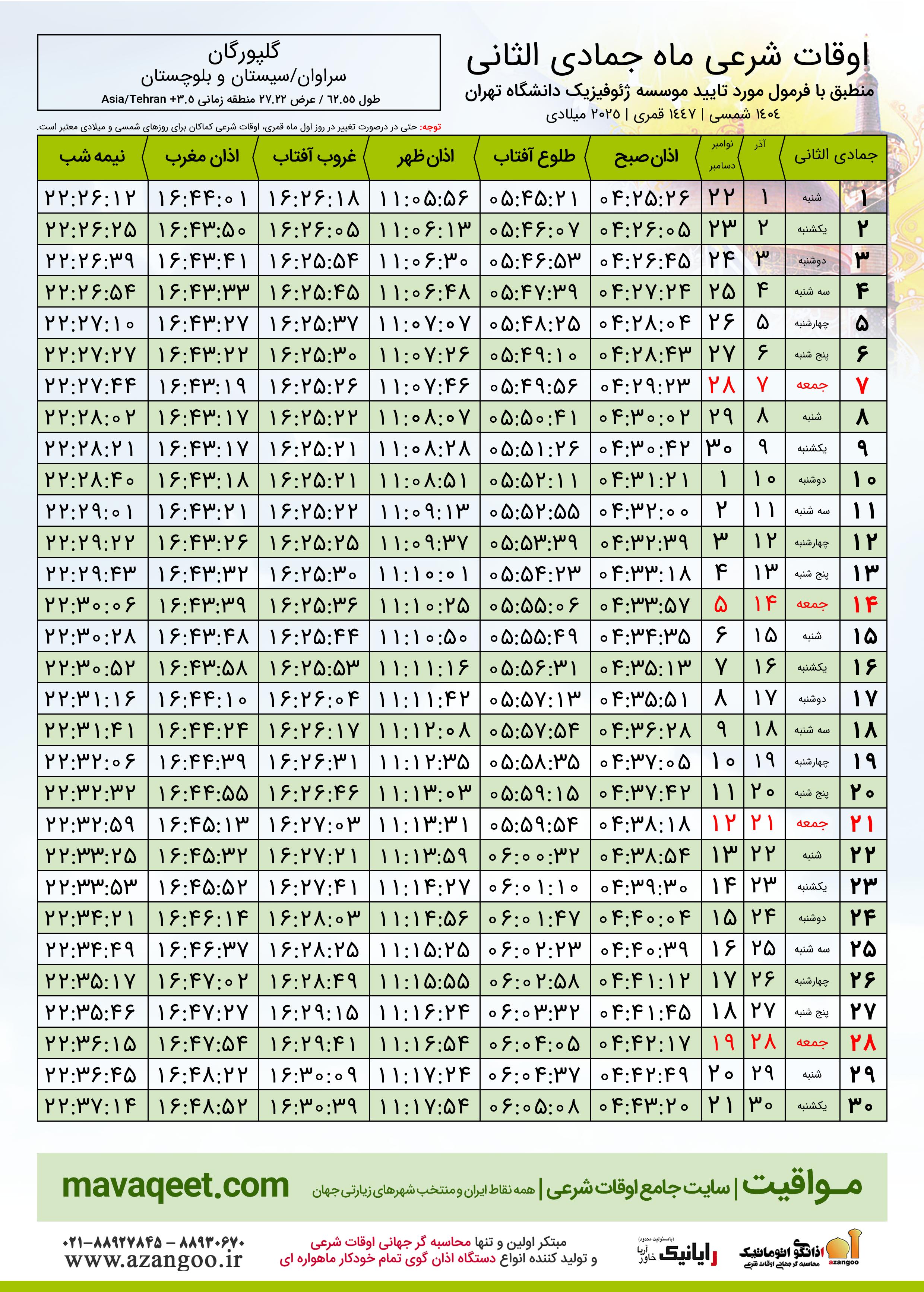 اوقات شرعی ماه جمادی الثانی ١٤٤٧ هـ.ق شهر گلپورگان بر