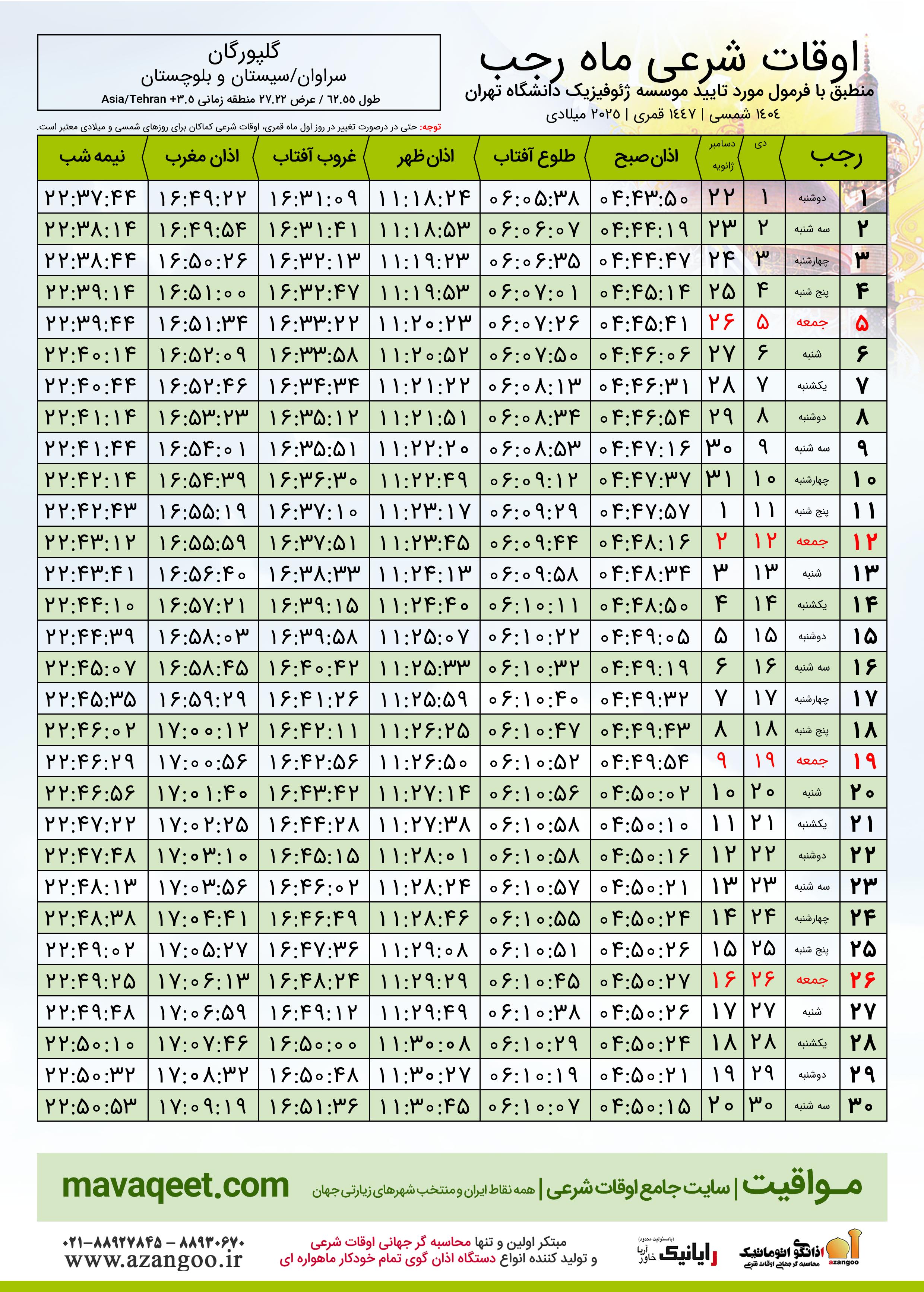 اوقات شرعی ماه رجب ١٤٤٧ هـ.ق شهر گلپورگان بر