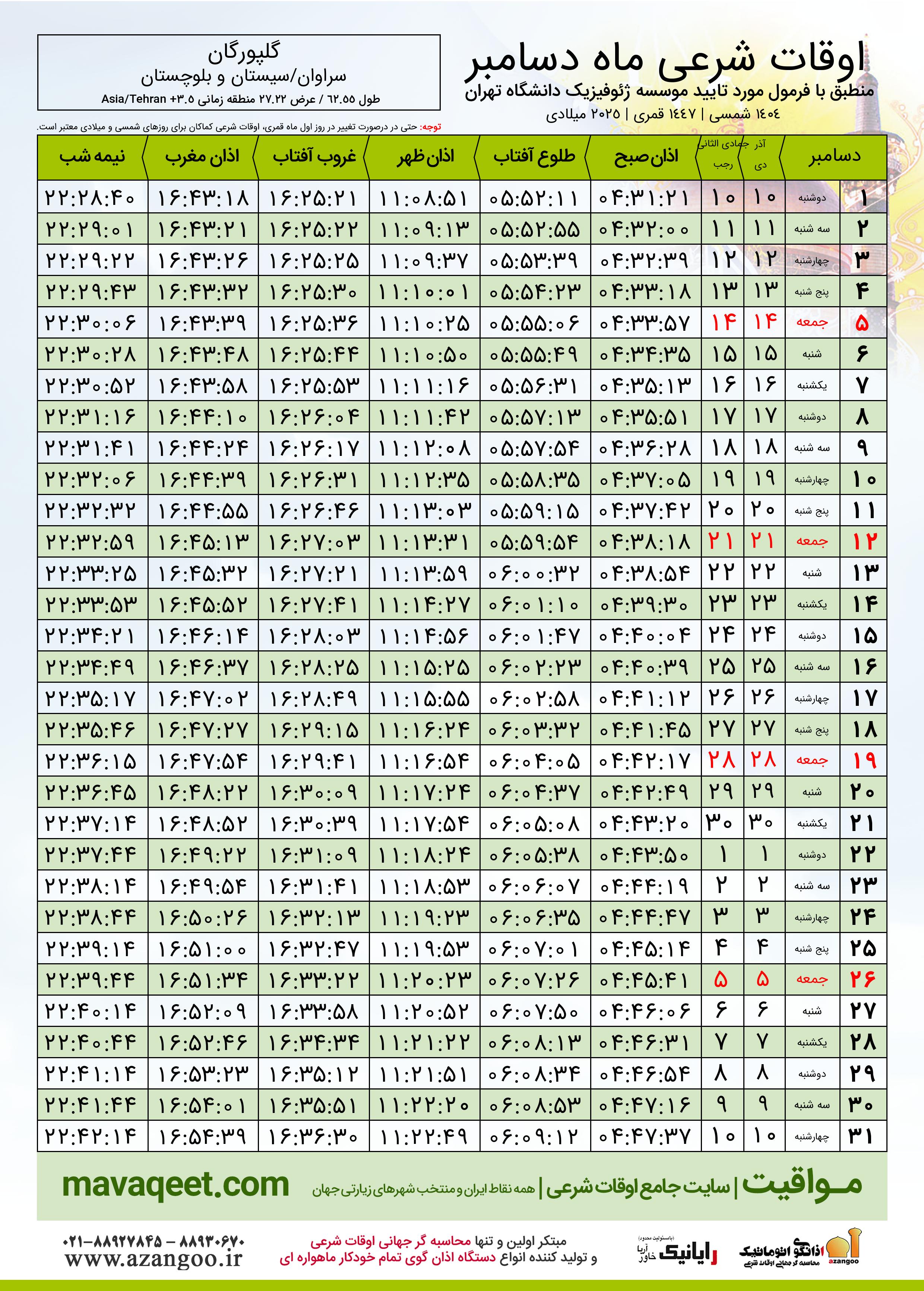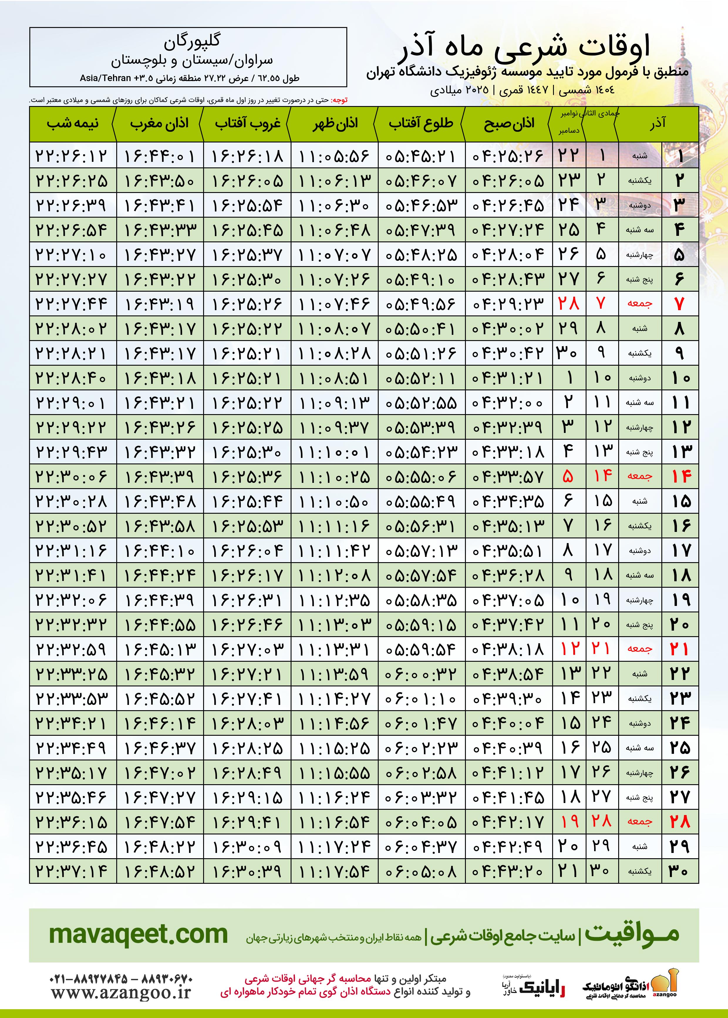 جدول اوقات شرعی آذر ١٤٠٤ شمسی شهر گلپورگان