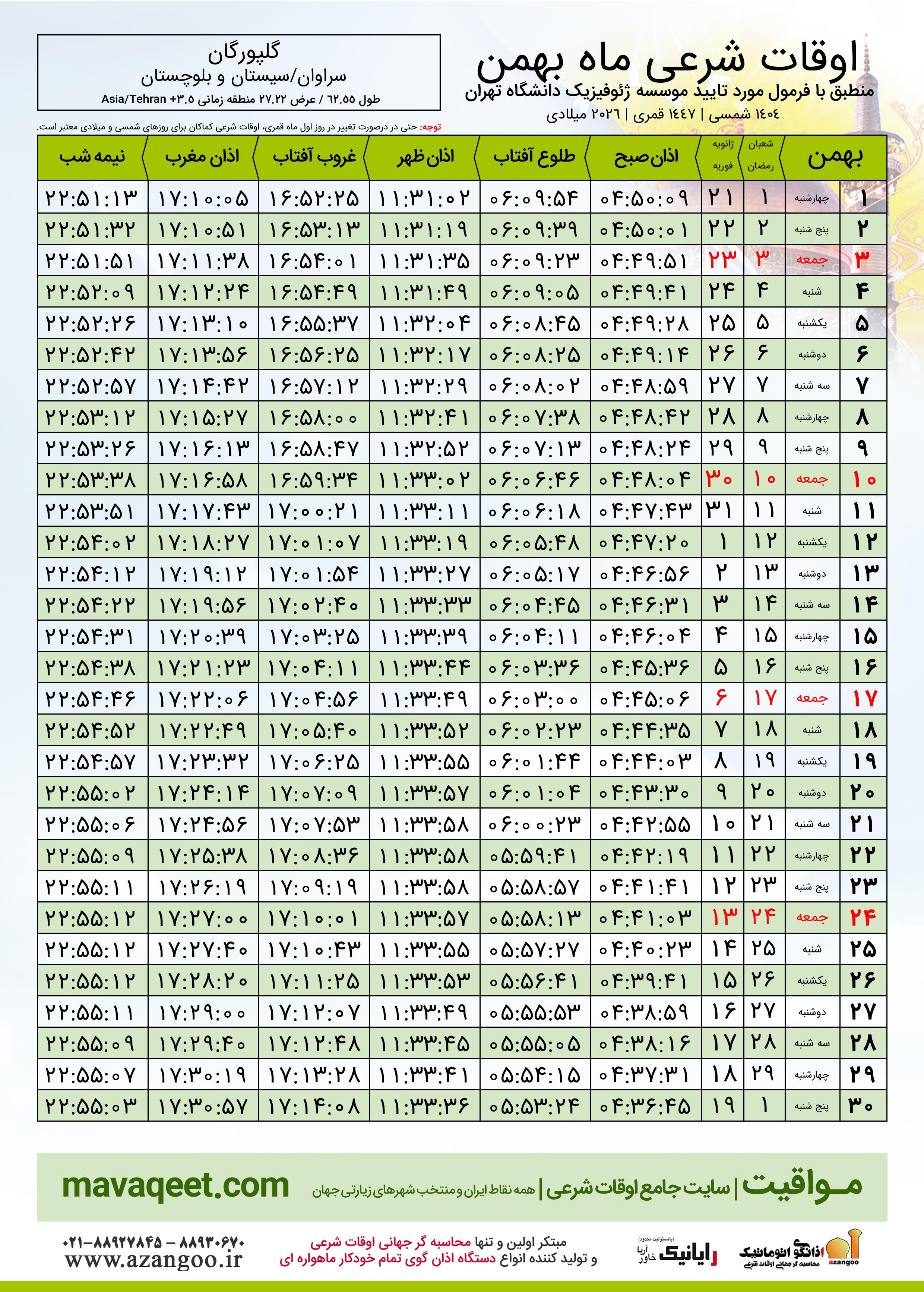 دانلود اوقات شرعی بهمن ٠٤ - ١٤٠٤ شهر گلپورگان