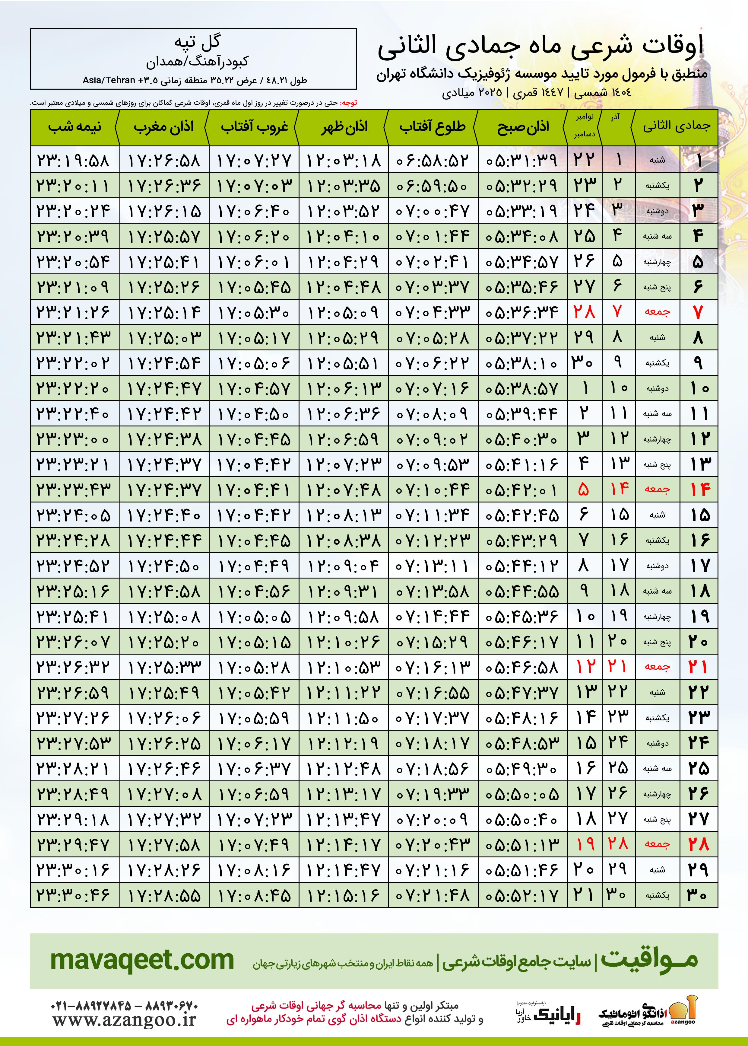 جدول اوقات شرعی جمادی الثانی ١٤٤٧ قمری شهر گل تپه