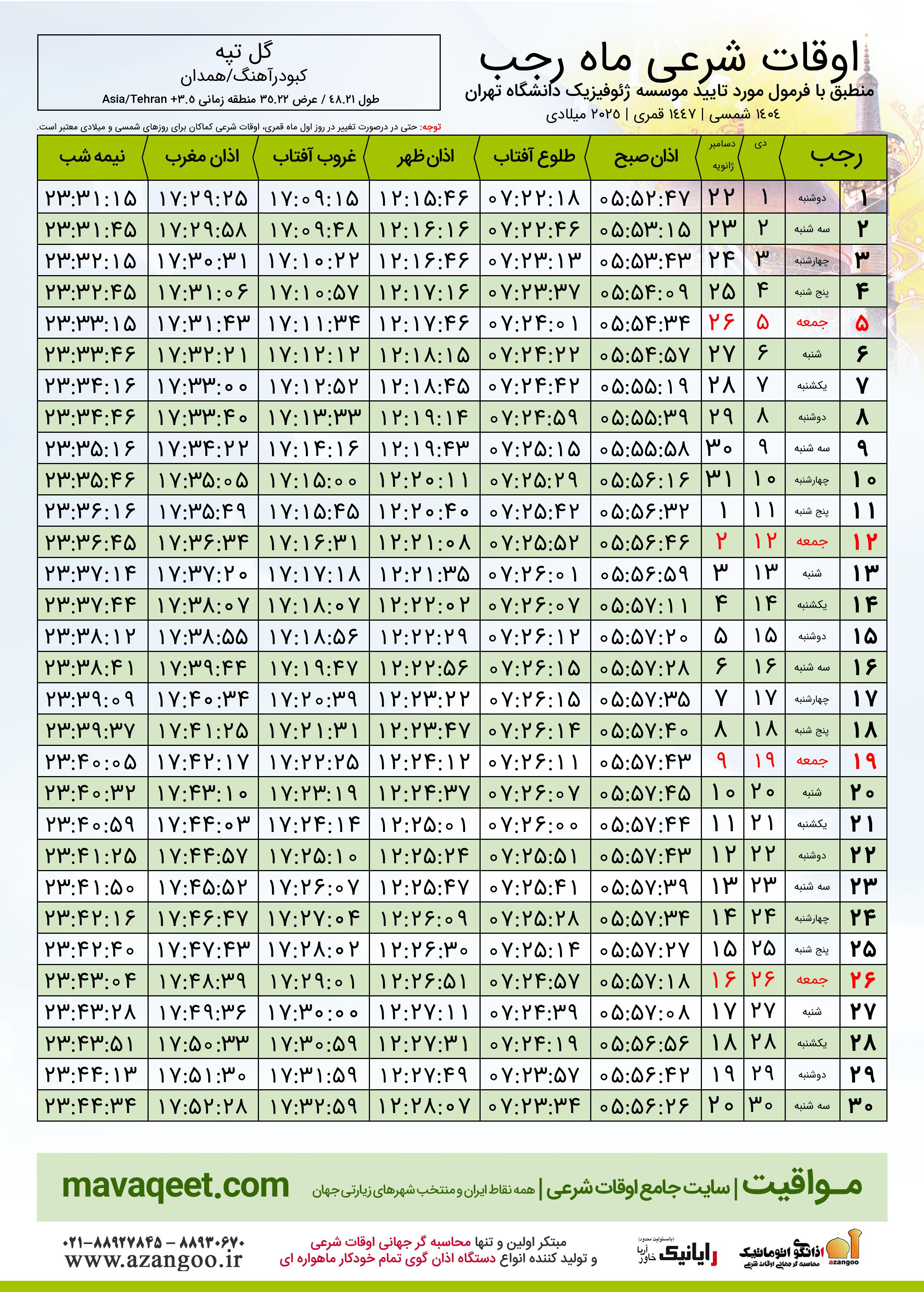 اوقات شرعی ماه رجب ١٤٤٧ هـ.ق شهر گل تپه بر