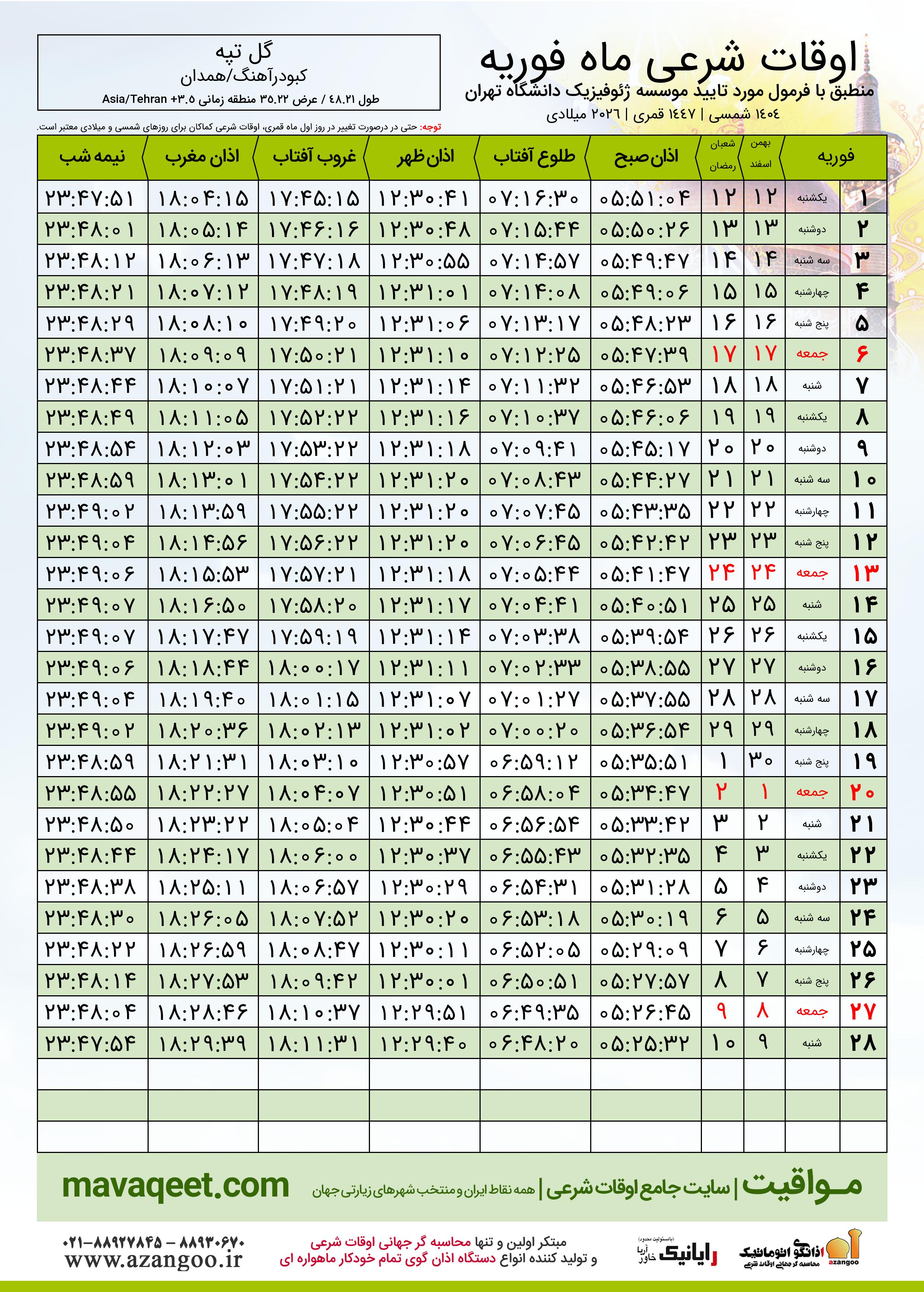دانلود اوقات شرعی فوریه ٢٠٢٦ شهر گل تپه