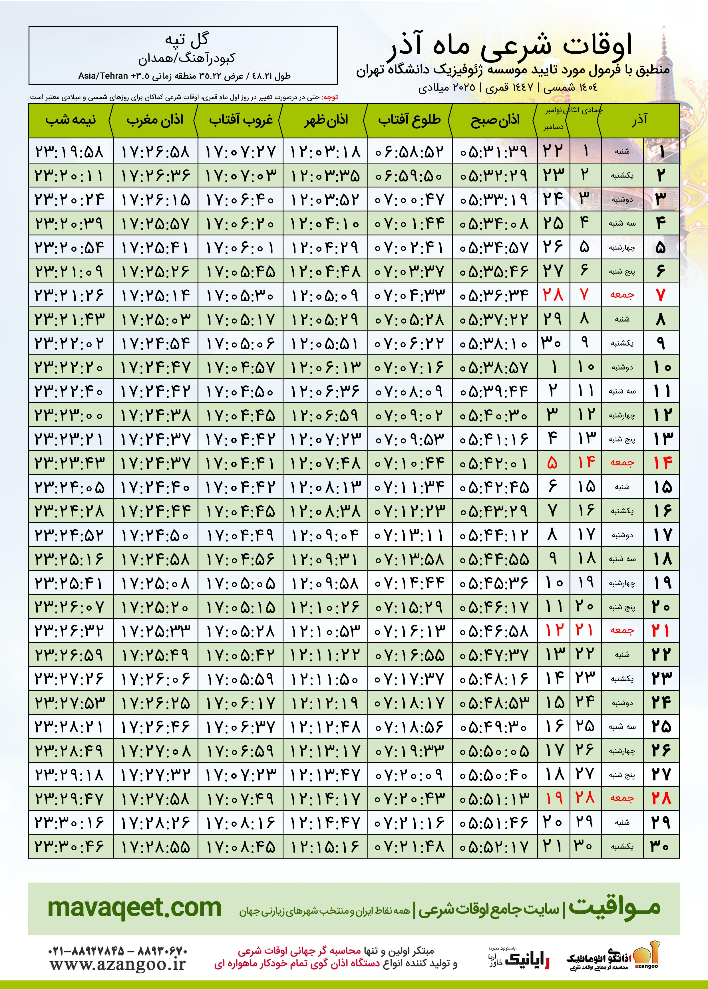 جدول اوقات شرعی آذر ١٤٠٤ شمسی شهر گل تپه