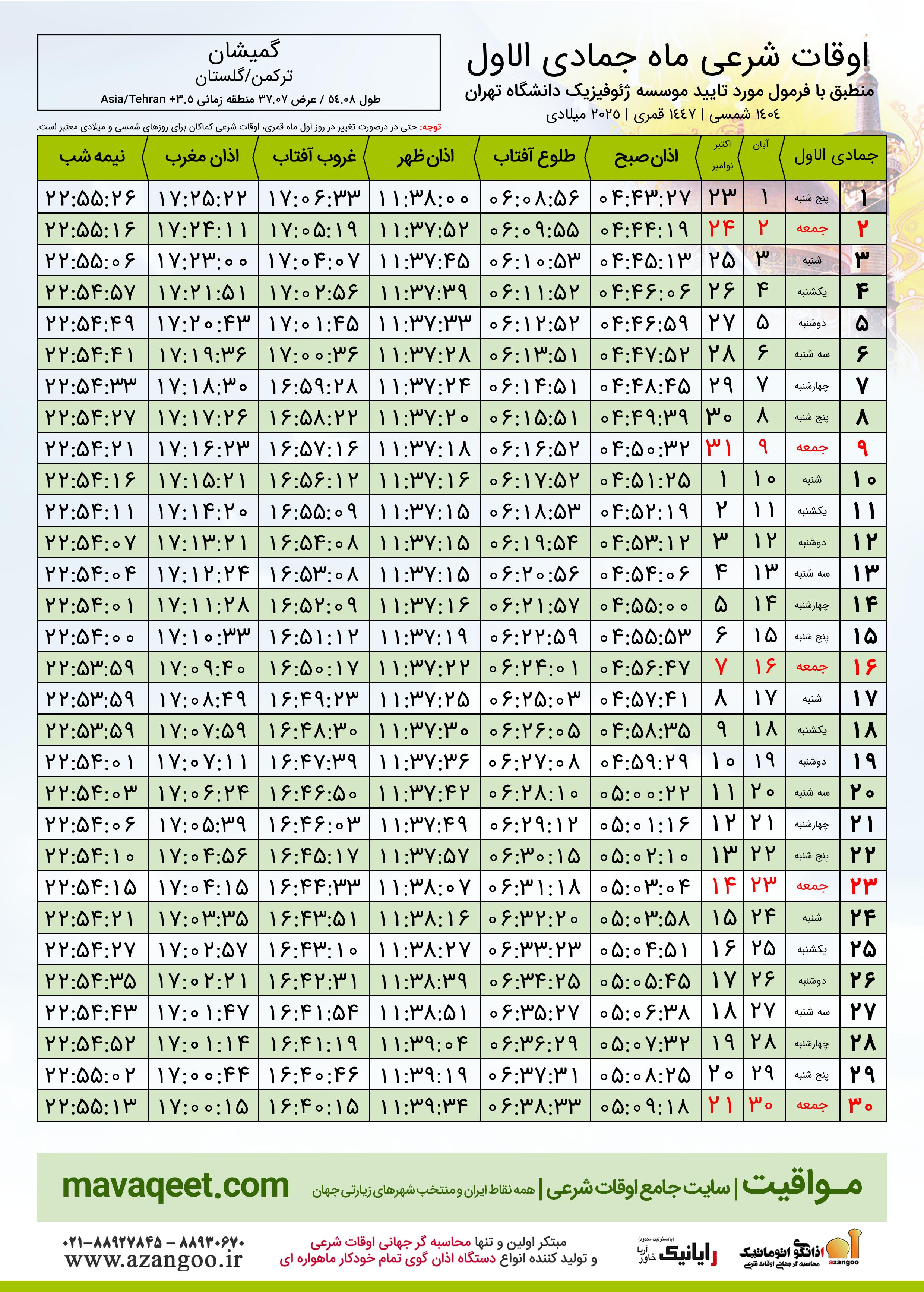 جدول اوقات شرعی جمادی الاول ١٤٤٧ قمری شهر گمیشان