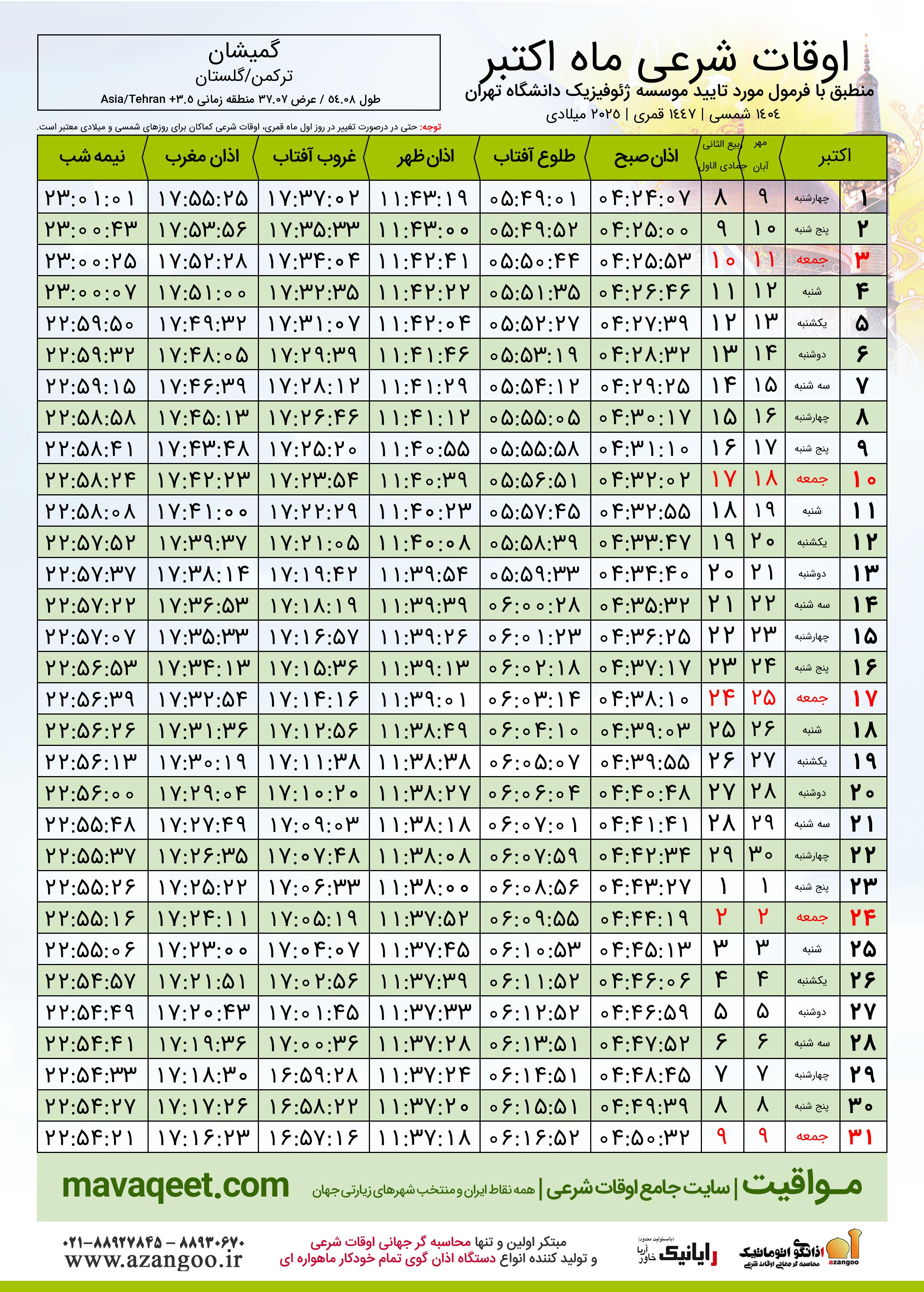 اوقات شرعی اکتبر ٢٠٢٥ میلادی شهر گمیشان