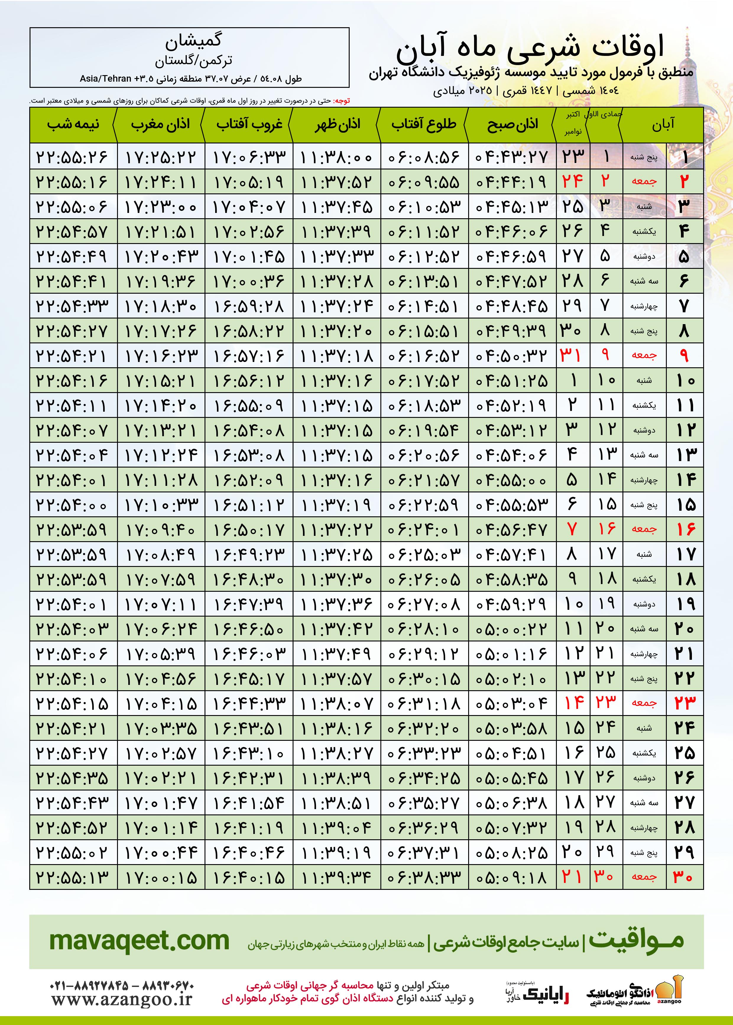جدول اوقات شرعی آبان ١٤٠٤ شمسی شهر گمیشان