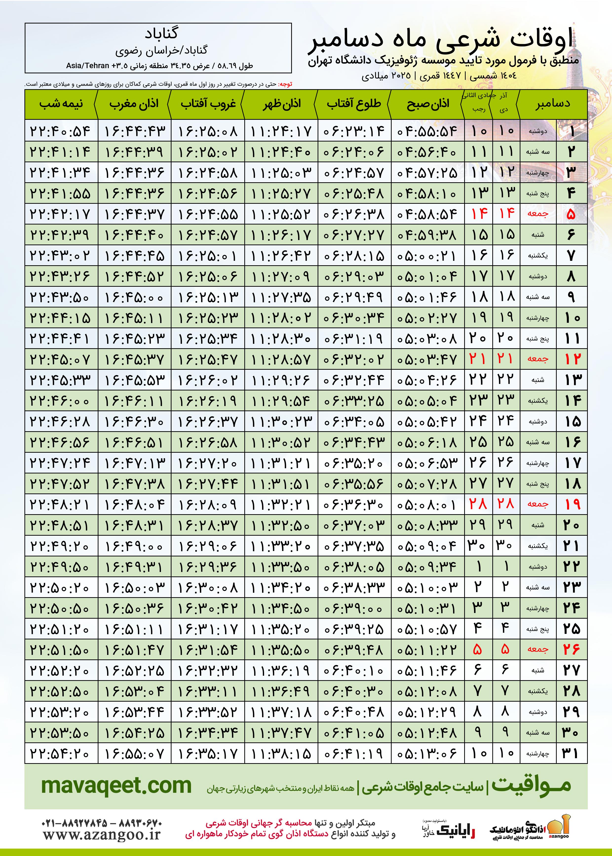 جدول اوقات شرعی دسامبر ٢٠٢٥ میلادی شهر گناباد