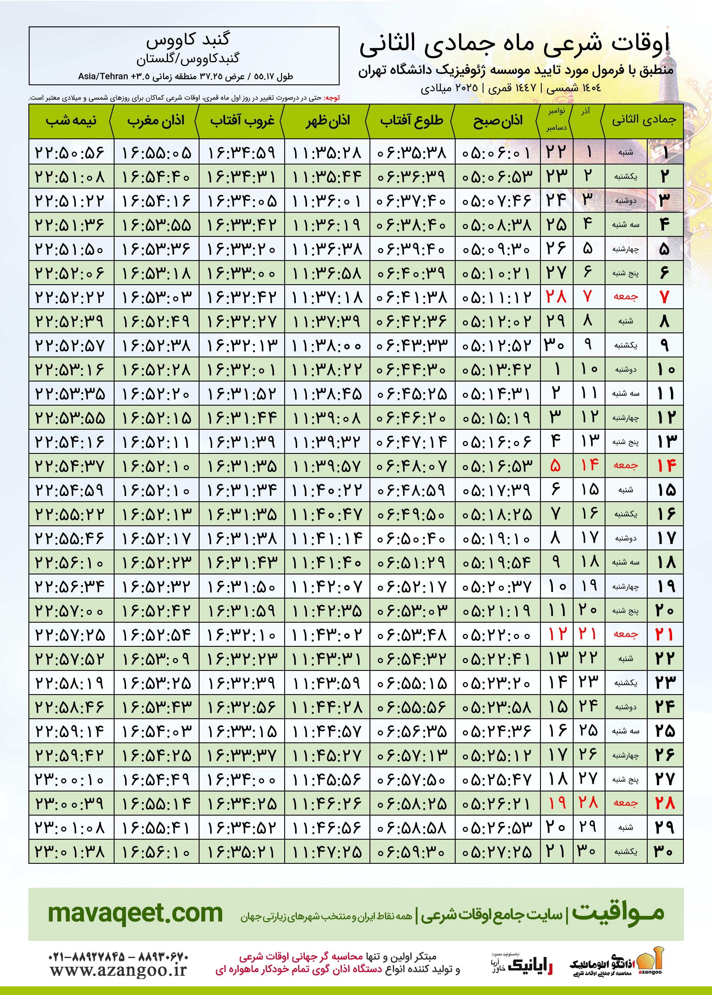 اوقات شرعی ماه جمادی الثانی ١٤٤٧ هـ.ق شهر گنبد کاووس بر