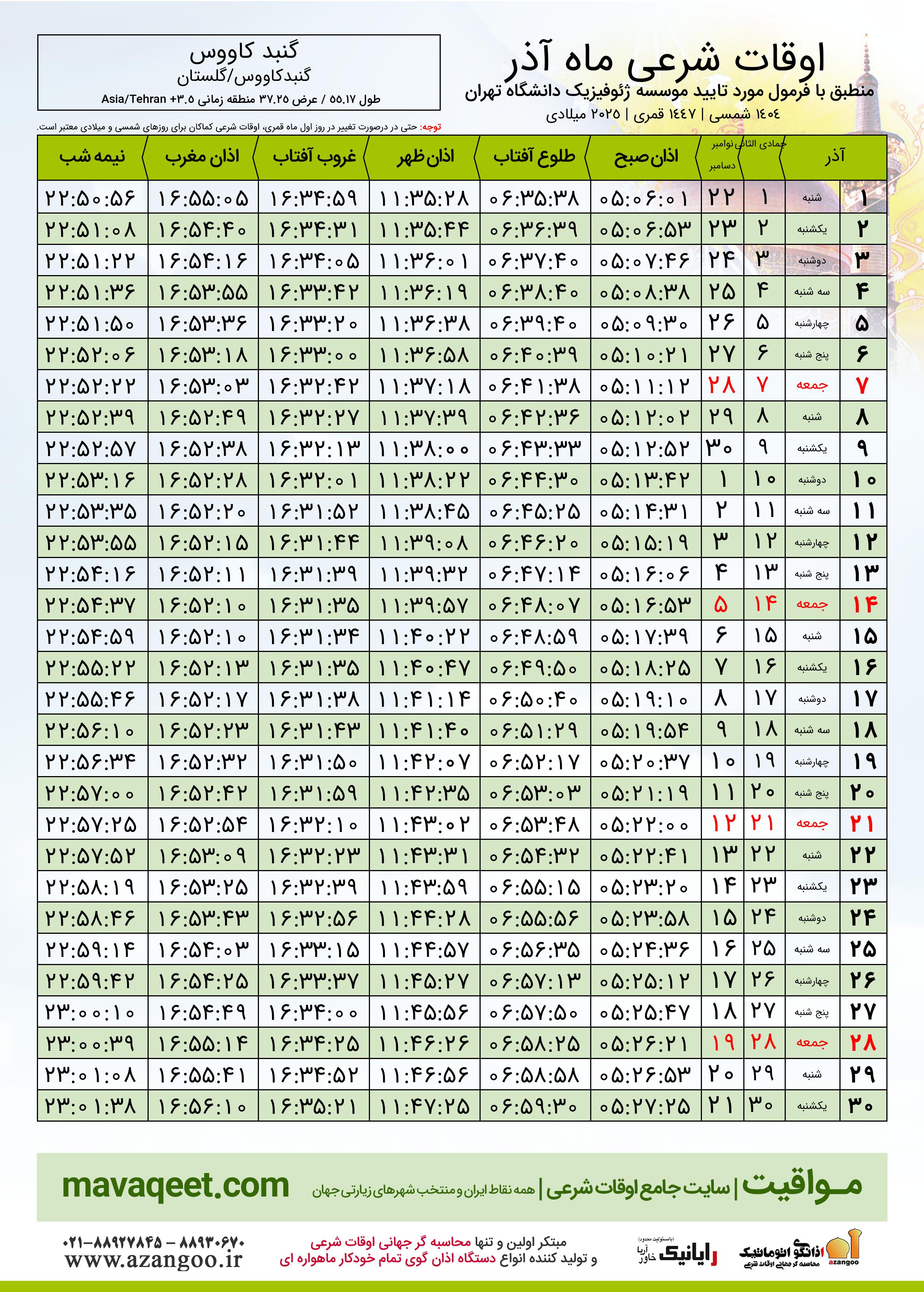 اوقات شرعی آذر ١٤٠٤ شمسی شهر گنبد کاووس
