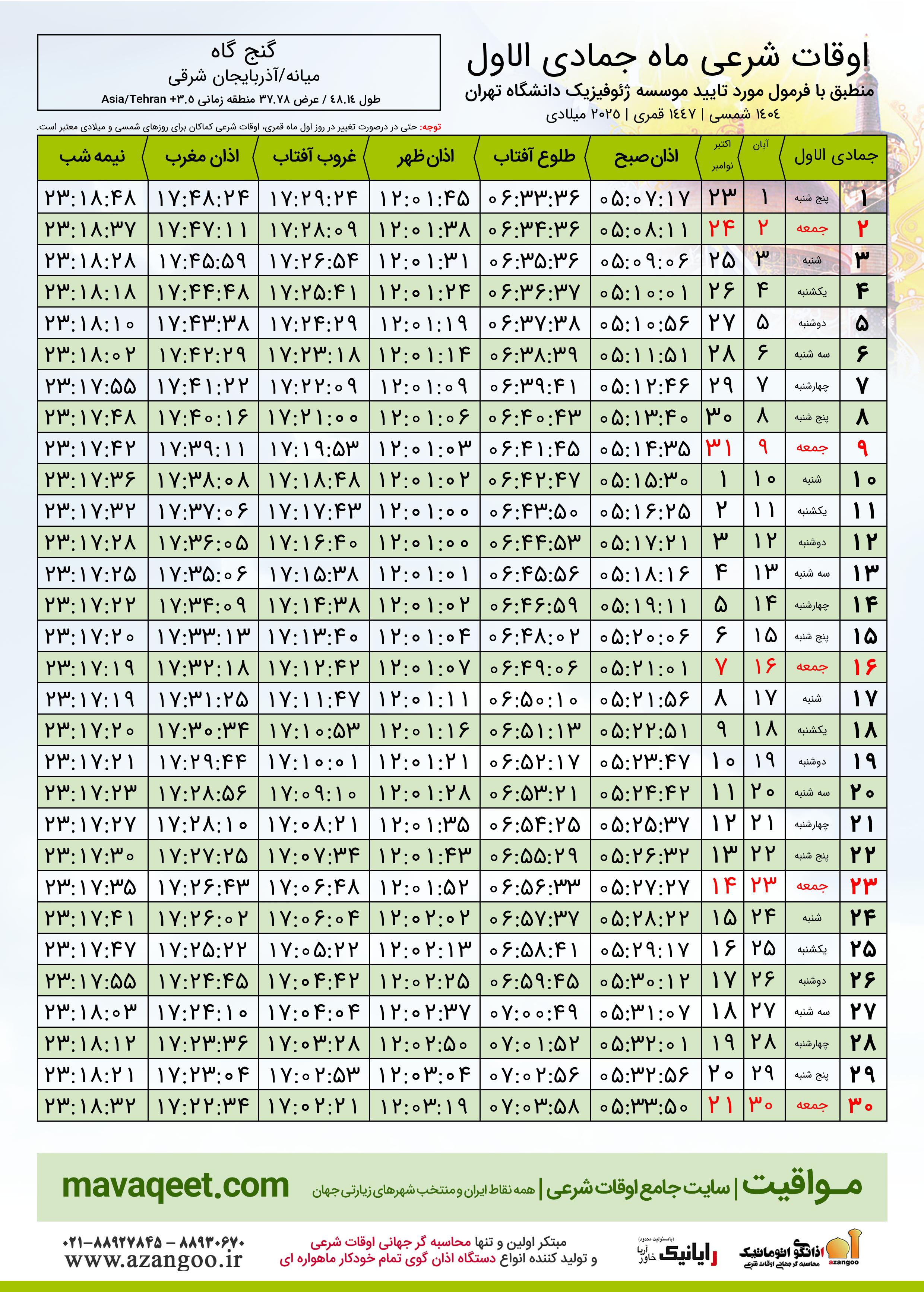 جدول اوقات شرعی جمادی الاول ١٤٤٧ قمری شهر گنج گاه