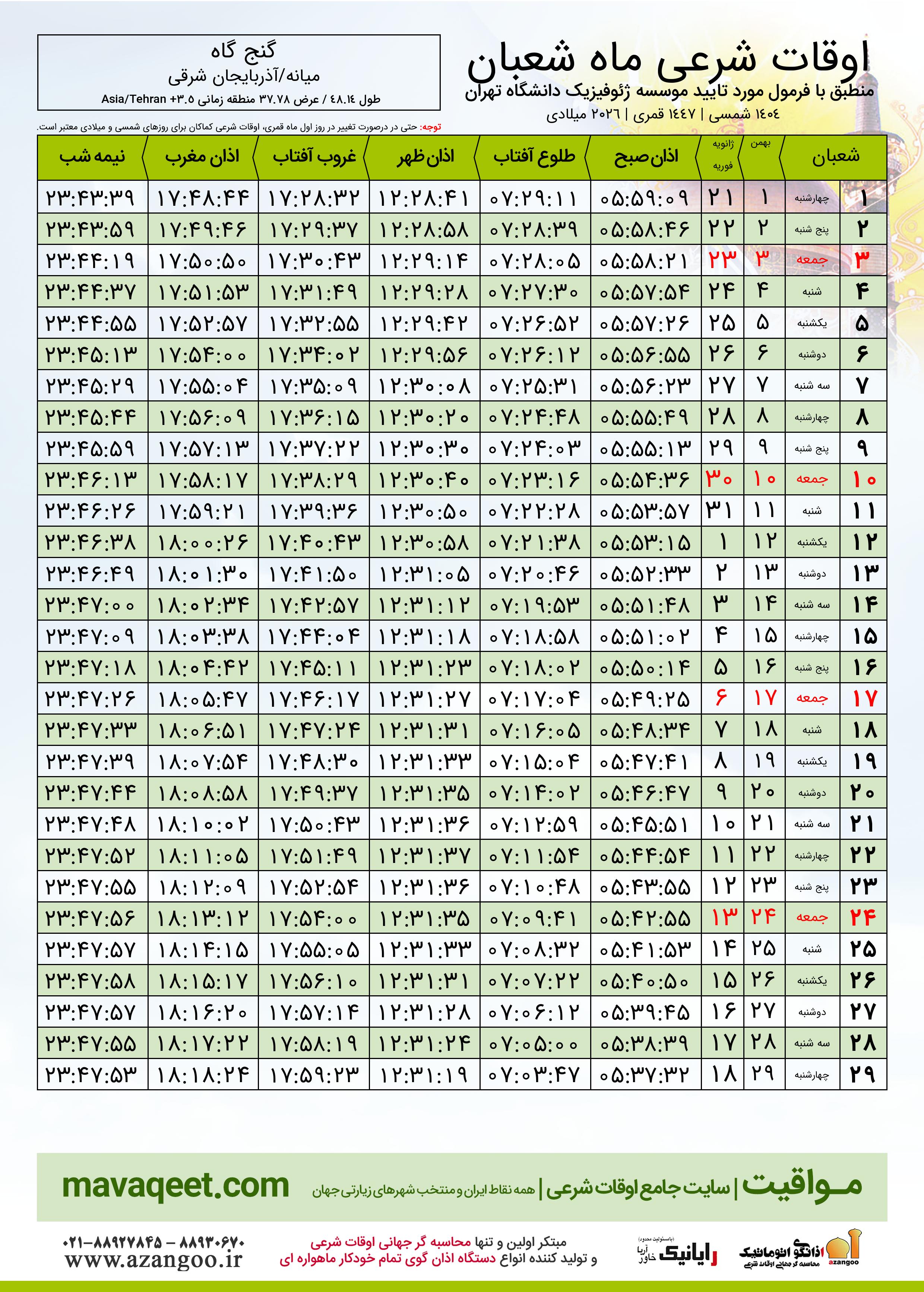 اوقات شرعی ماه شعبان ١٤٤٧ هـ.ق شهر گنج گاه بر