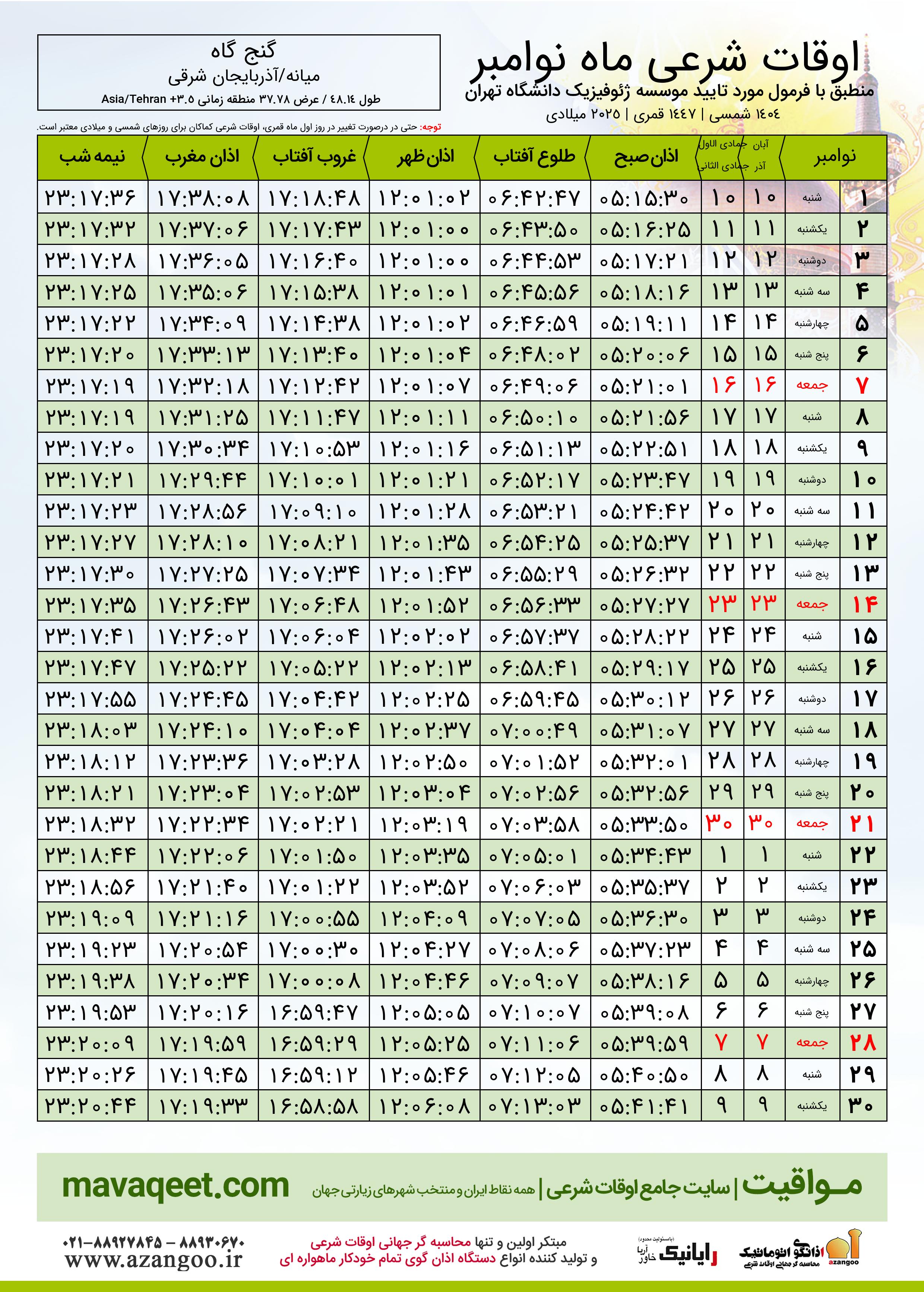 جدول اوقات شرعی نوامبر ٢٠٢٥ میلادی شهر گنج گاه