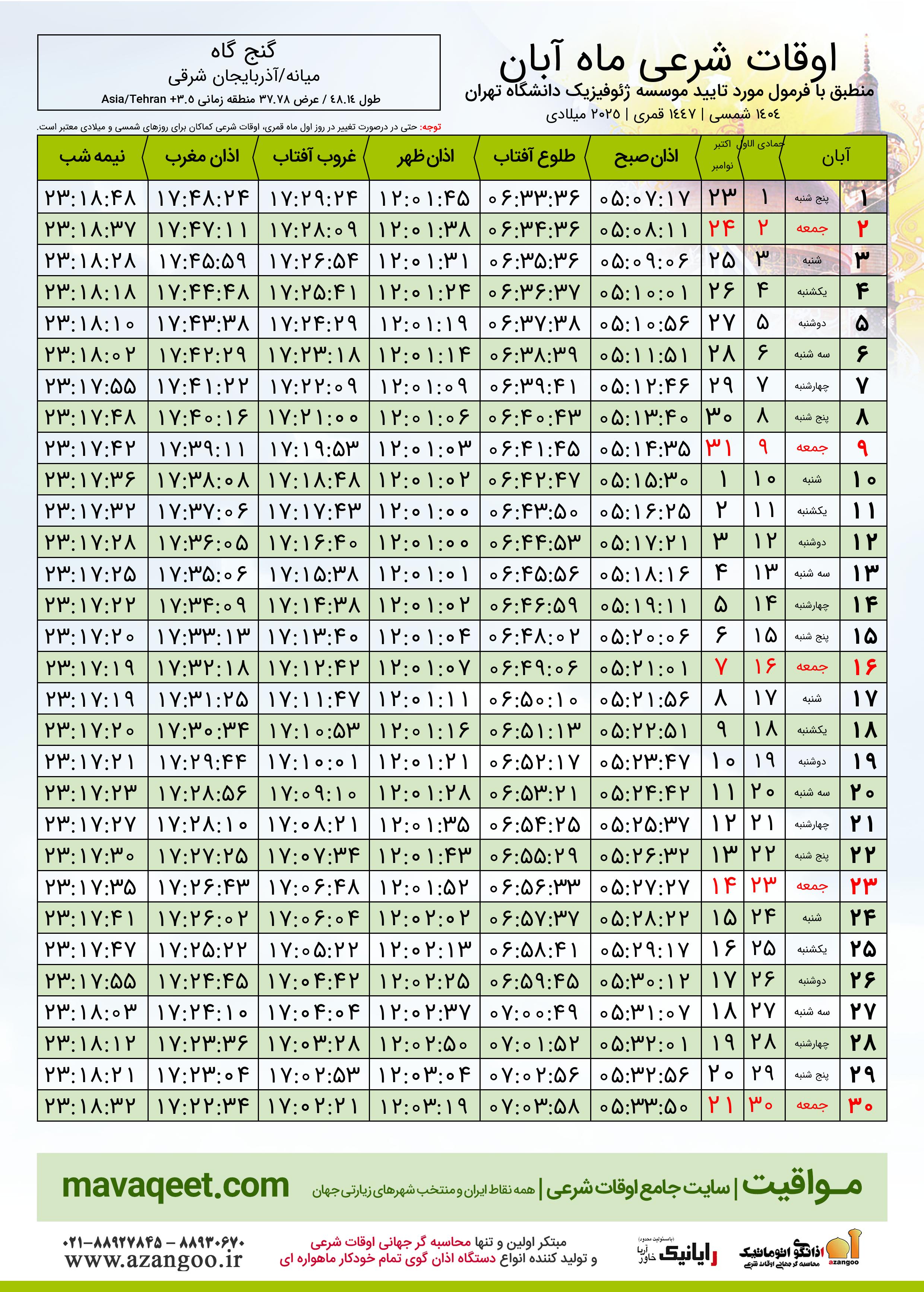 اوقات شرعی آبان ١٤٠٤ شمسی شهر گنج گاه