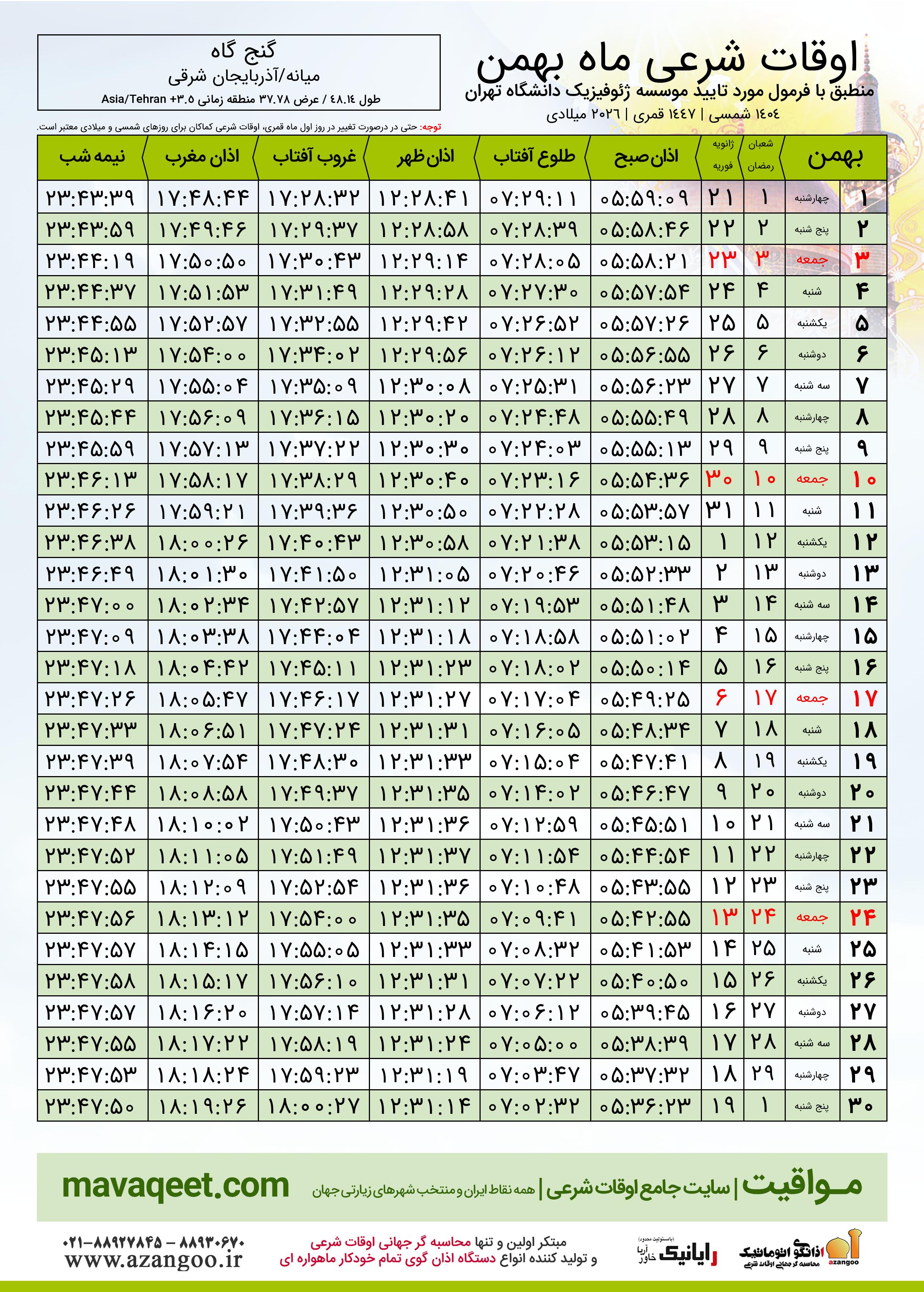 اوقات شرعی بهمن ١٤٠٤ شمسی شهر گنج گاه