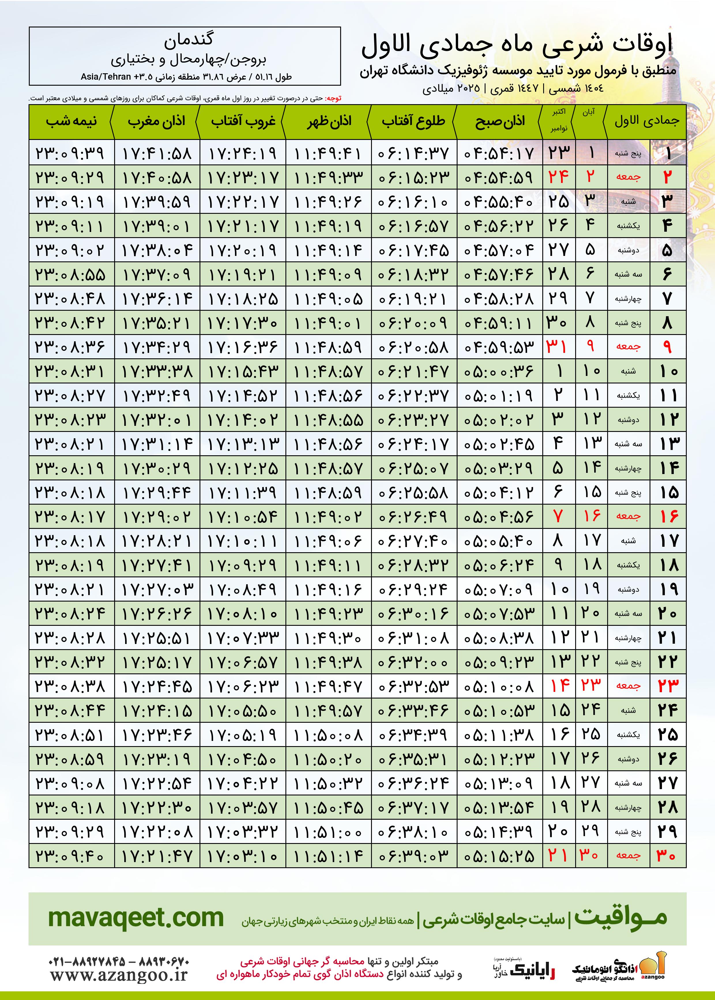 اوقات شرعی ماه جمادی الاول ١٤٤٧ هـ.ق شهر گندمان بر