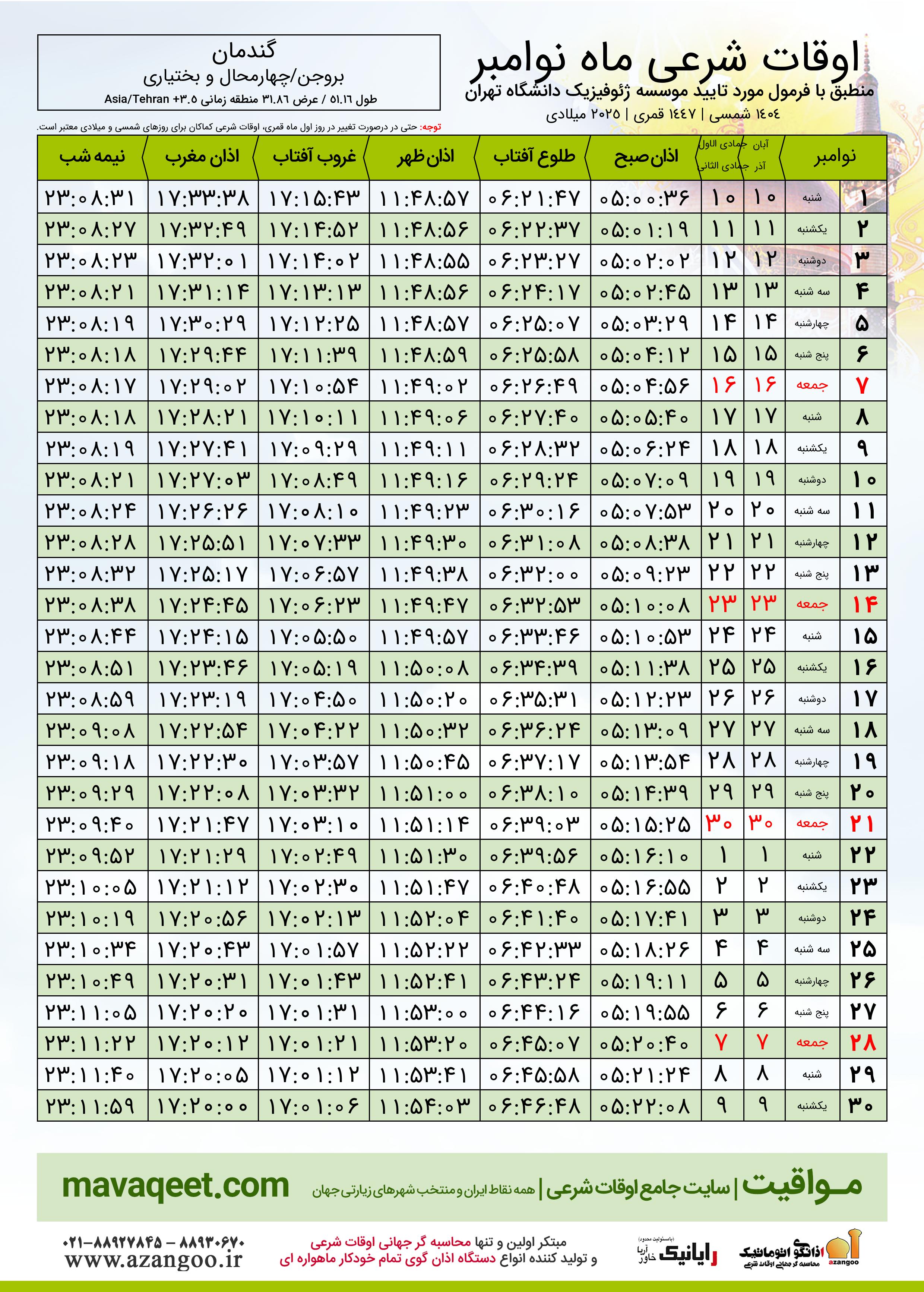 جدول اوقات شرعی نوامبر ٢٠٢٥ میلادی شهر گندمان