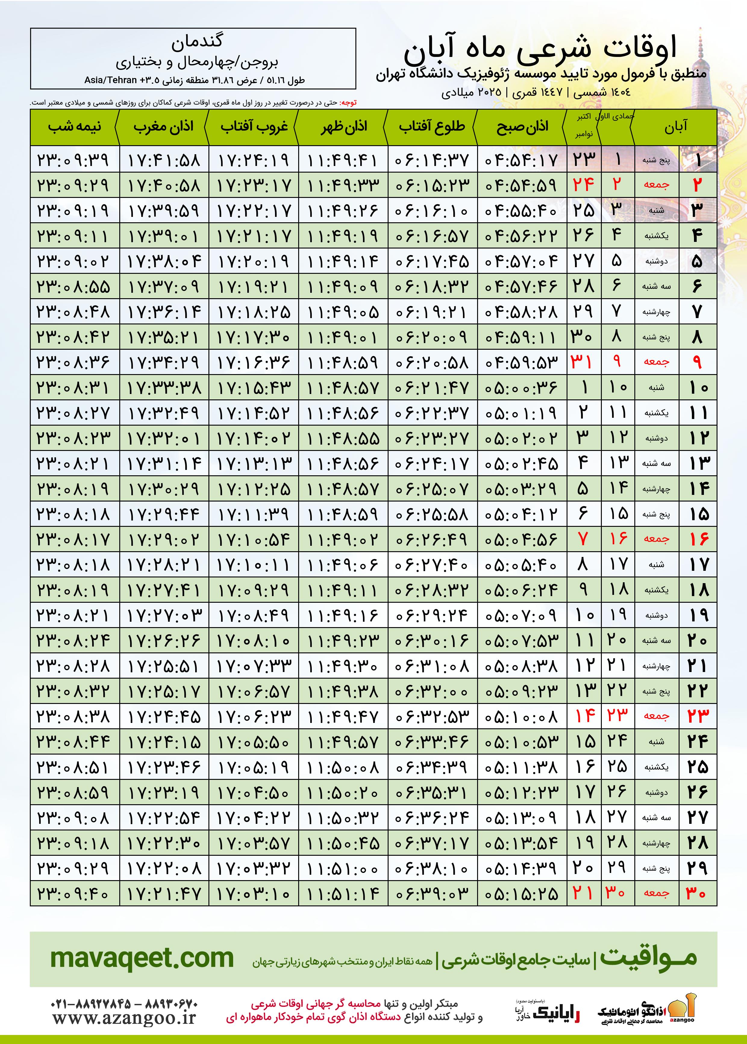 جدول اوقات شرعی آبان ١٤٠٤ شمسی شهر گندمان