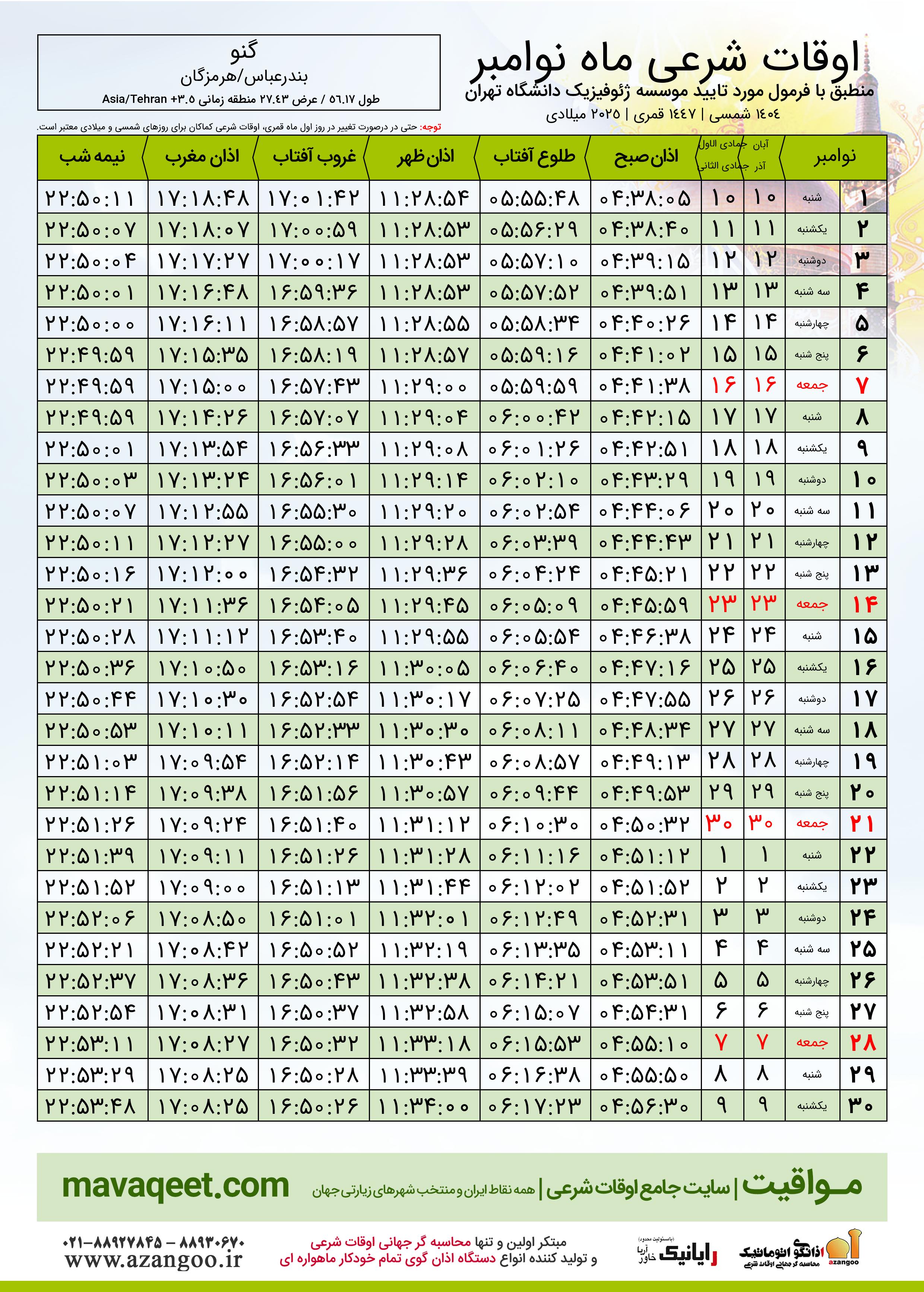 اوقات شرعی آبان ١٤٠٤ شمسی شهر گنو