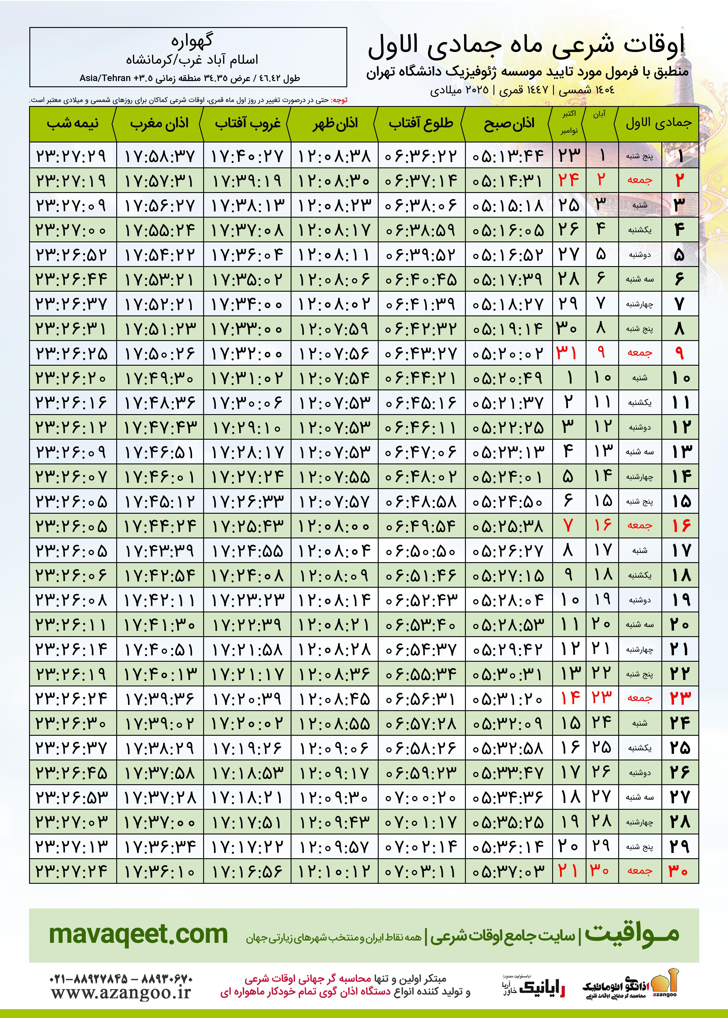 اوقات شرعی ماه جمادی الاول ١٤٤٧ هـ.ق شهر گهواره بر