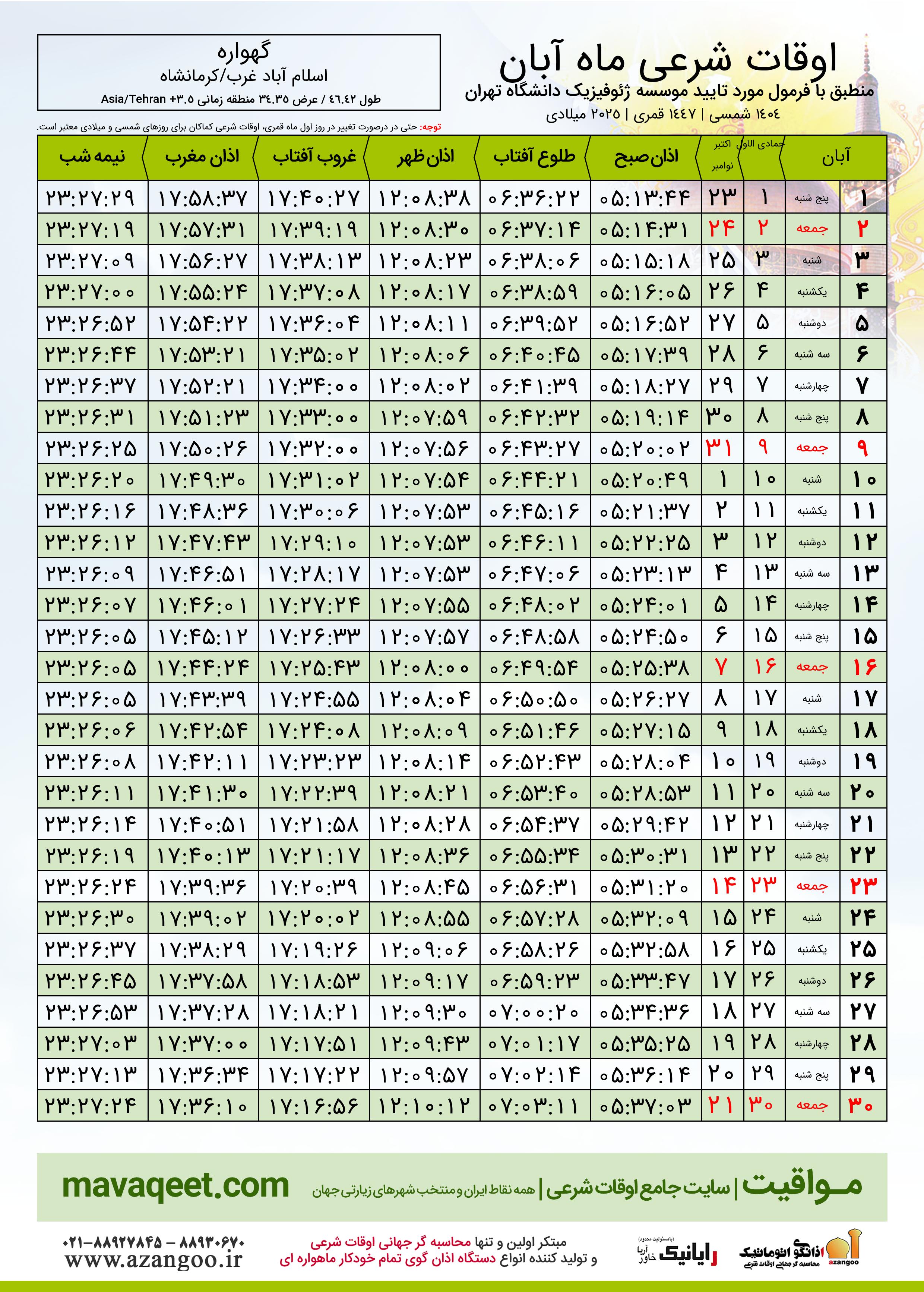 جدول اوقات شرعی آبان ١٤٠٤ شمسی شهر گهواره