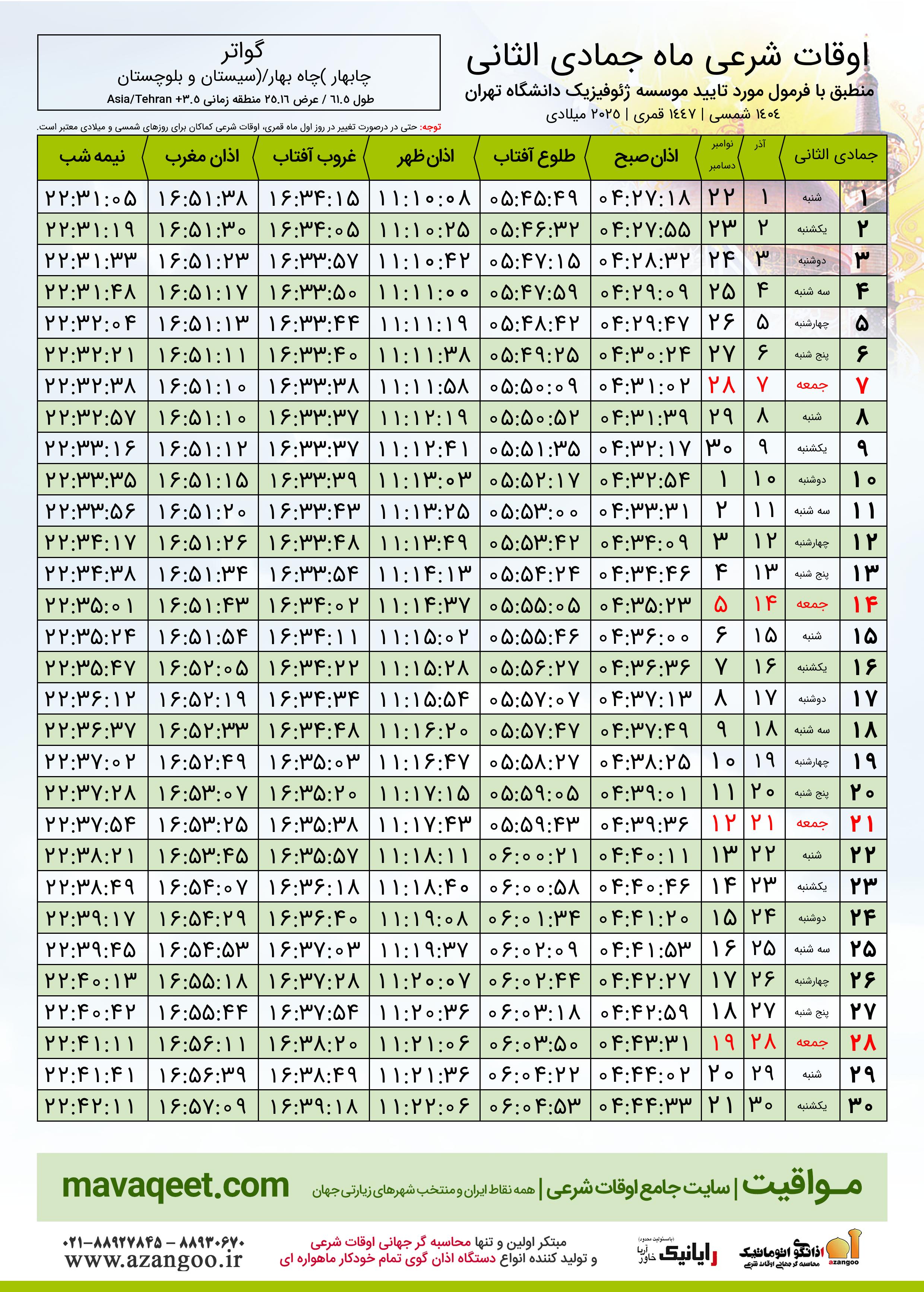 اوقات شرعی ماه جمادی الثانی ١٤٤٧ هـ.ق شهر گواتر بر