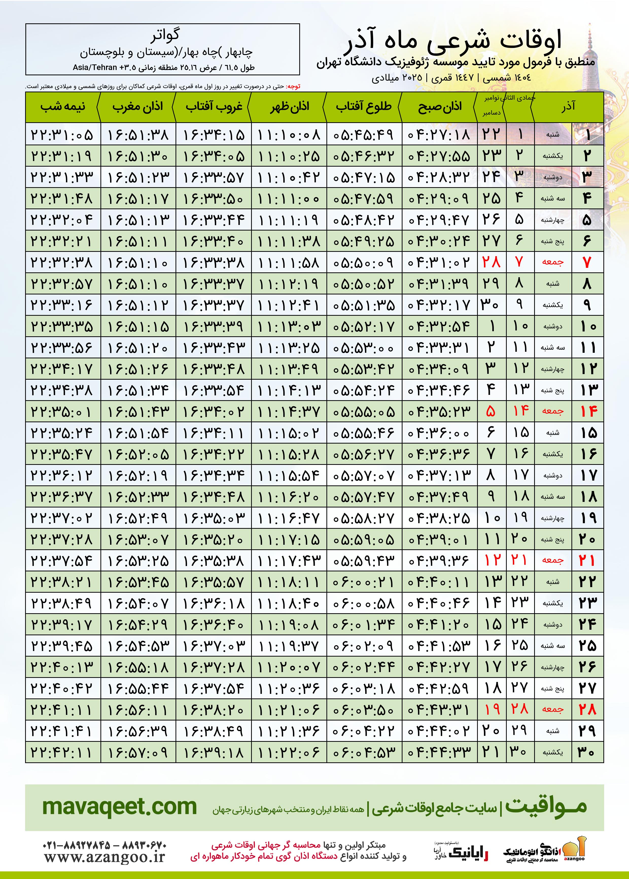 جدول اوقات شرعی آذر ١٤٠٤ شمسی شهر گواتر