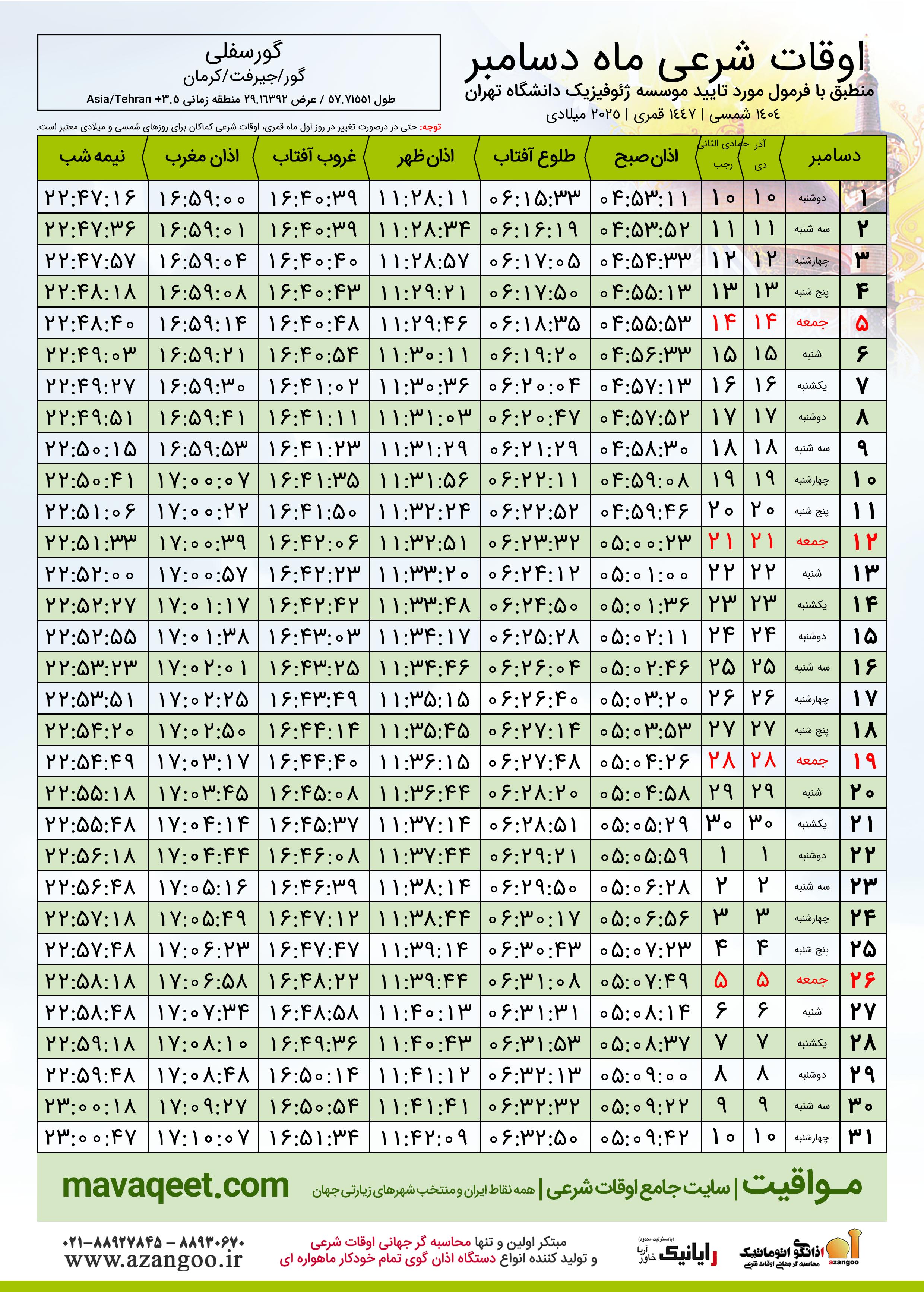 جدول اوقات شرعی دسامبر ٢٠٢٥ میلادی روستای گورسفلی