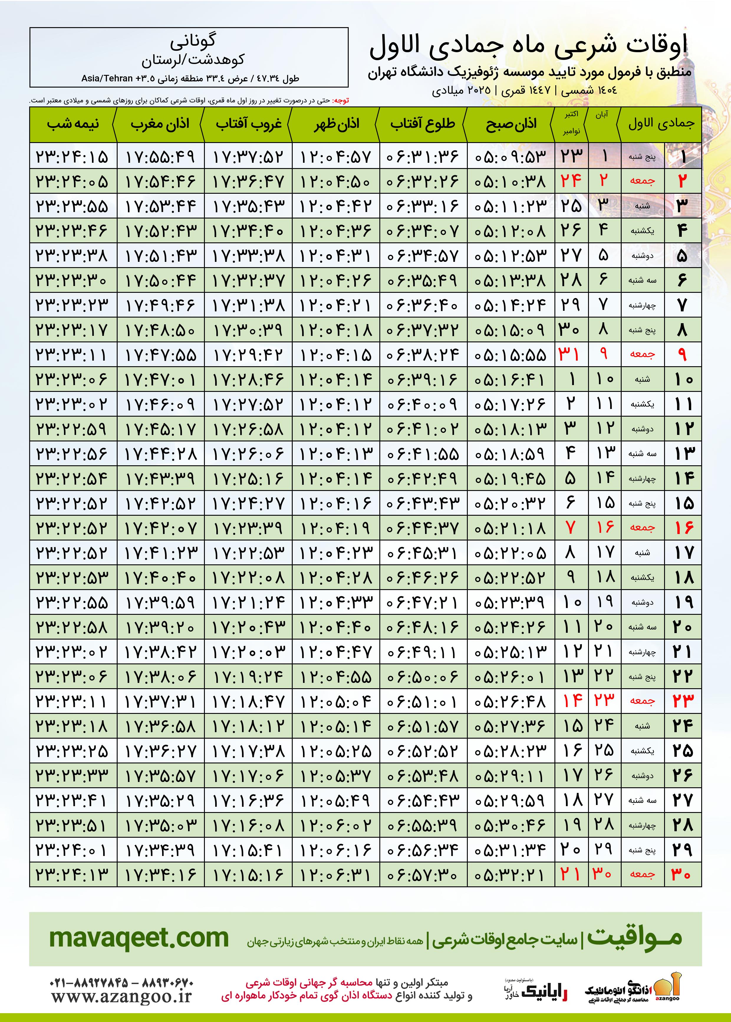 جدول اوقات شرعی جمادی الاول ١٤٤٧ قمری شهر گونانی