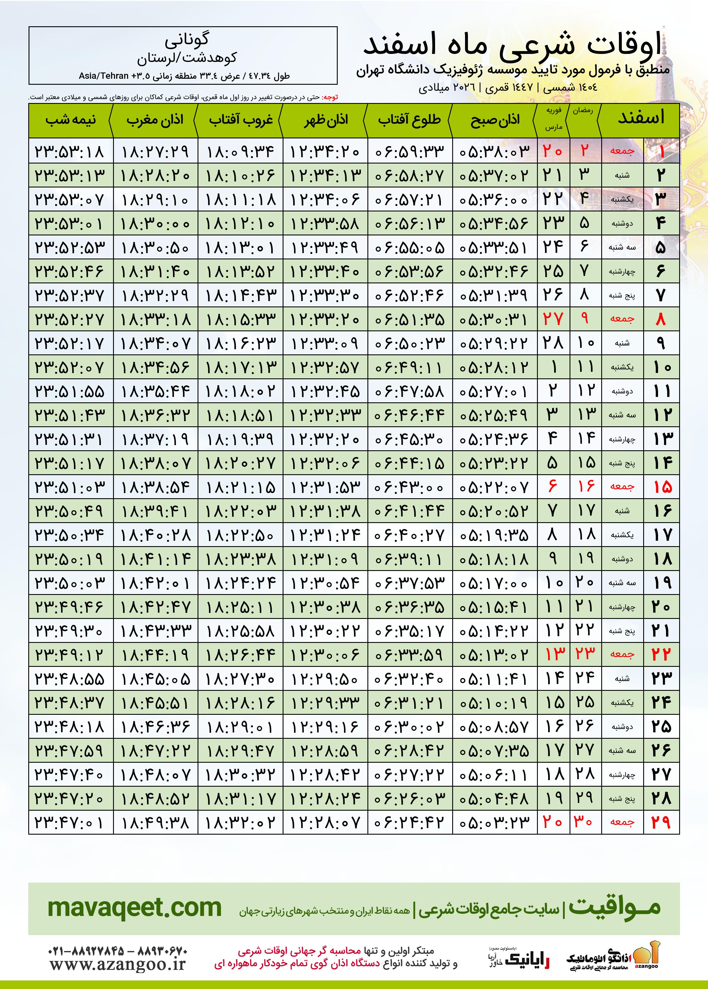 دانلود اوقات شرعی ماه رمضان ٠٤ - ١٤٠٤ شمسی | ٢٠٢٦ میلادی | ١٤٤٧ قمری شهر گونانی
