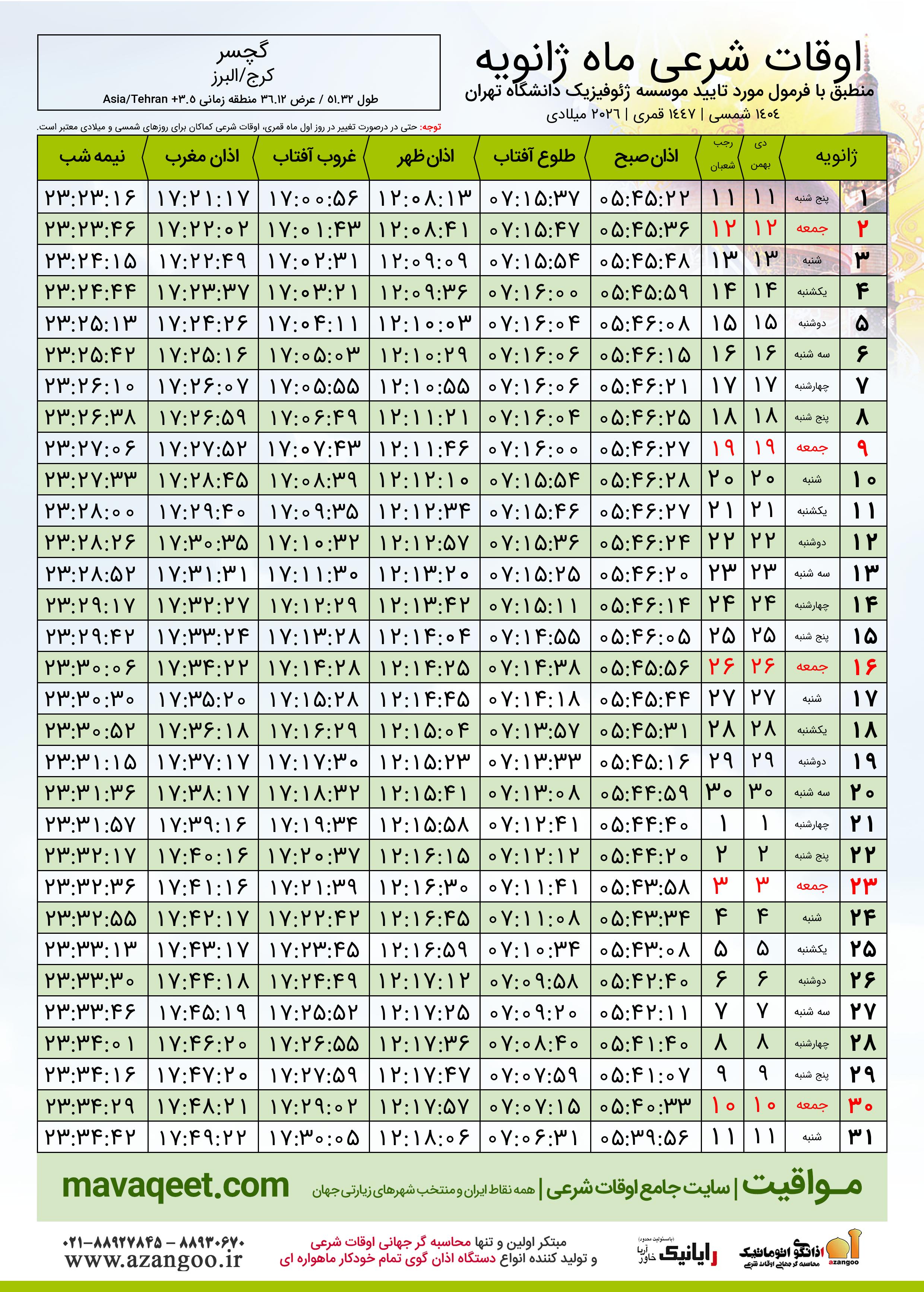 اوقات شرعی ماه رجب ١٤٤٧ هـ.ق شهر گچسر بر