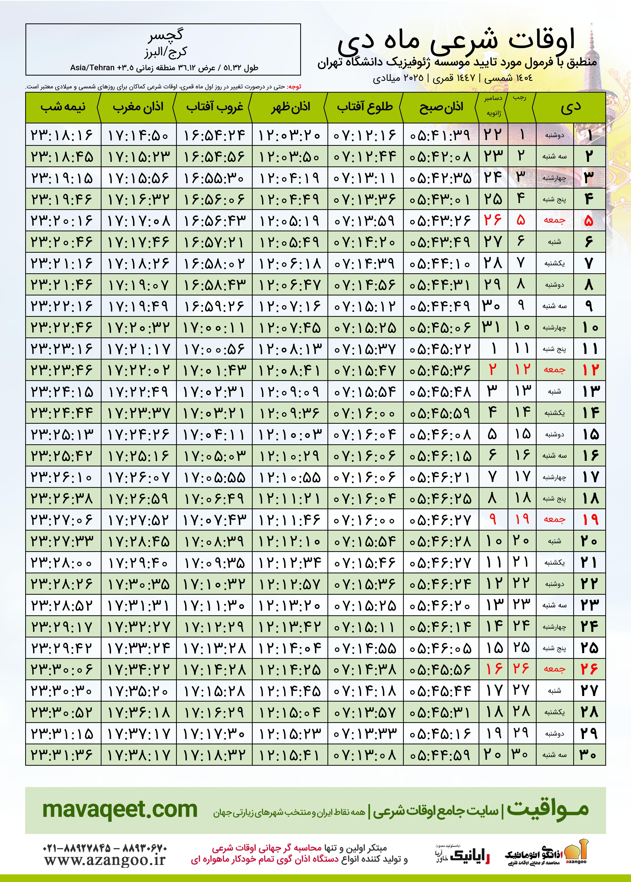 جدول اوقات شرعی دی ١٤٠٤ شمسی شهر گچسر
