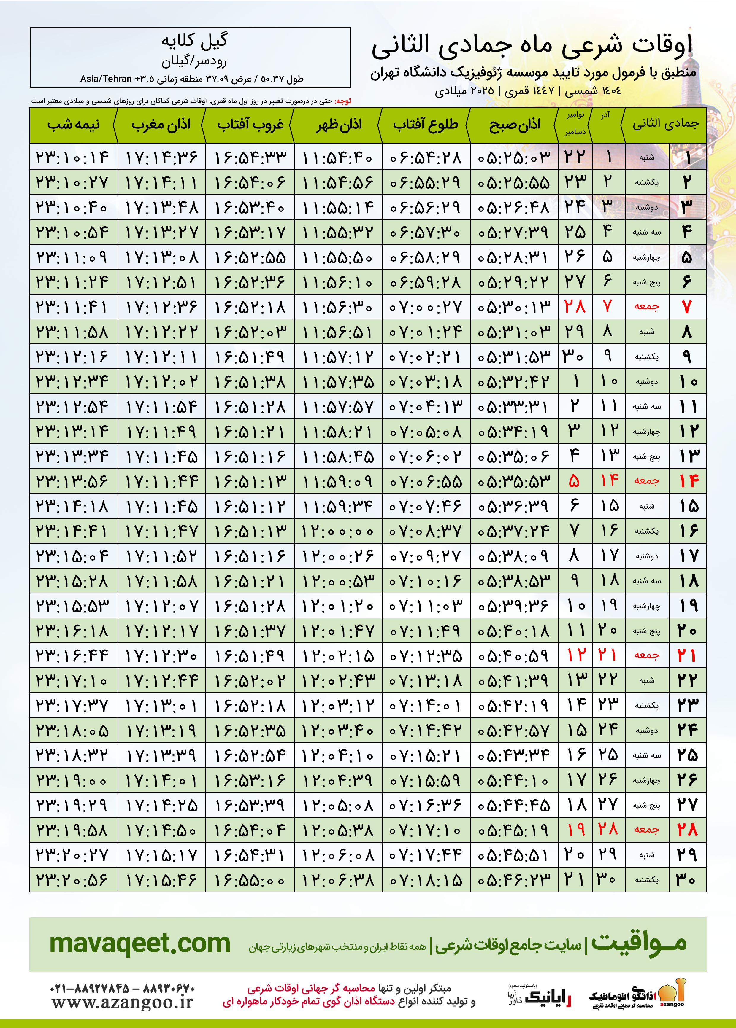 جدول اوقات شرعی جمادی الثانی ١٤٤٧ قمری شهر گیل کلایه