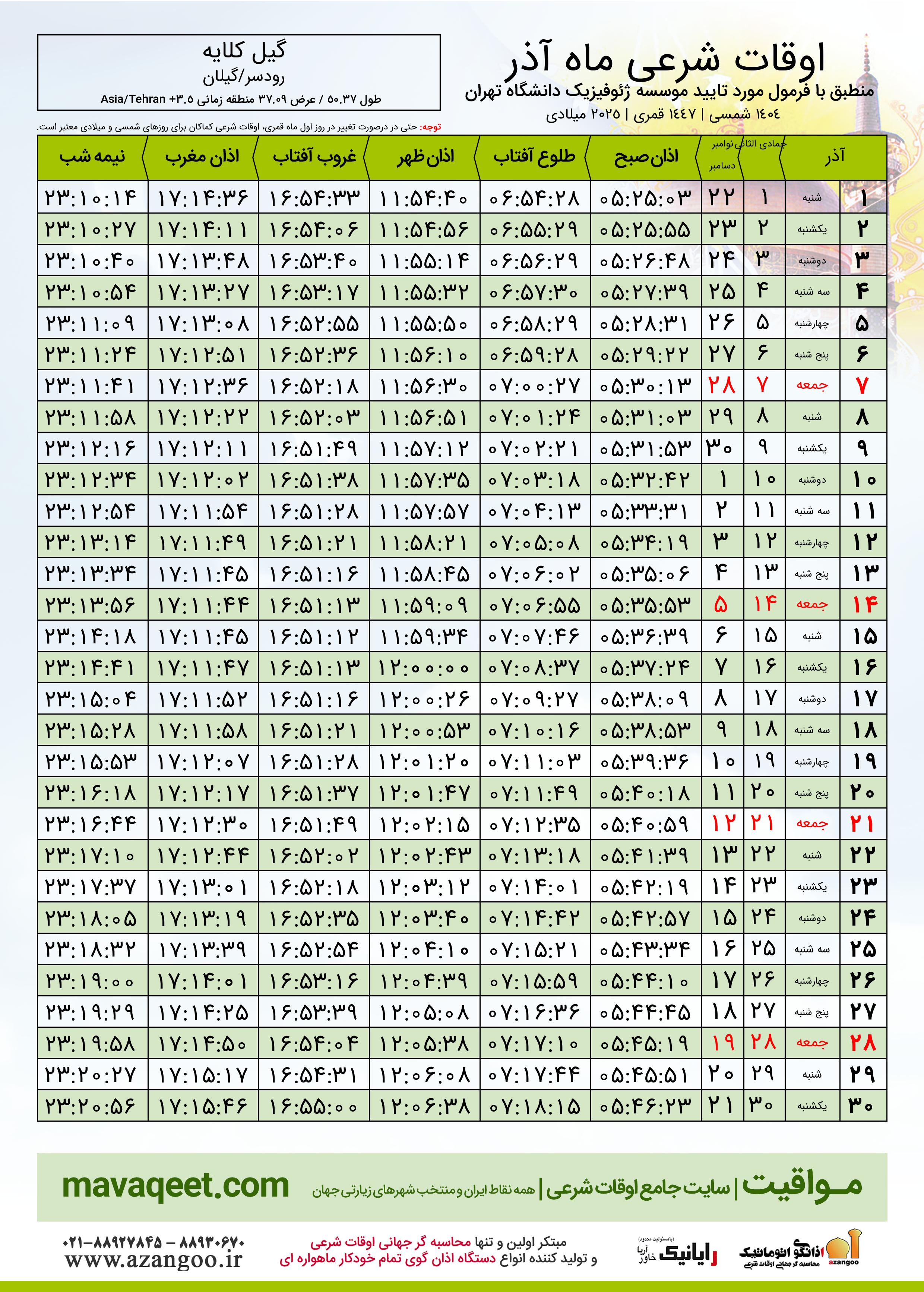 جدول اوقات شرعی آذر ١٤٠٤ شمسی شهر گیل کلایه