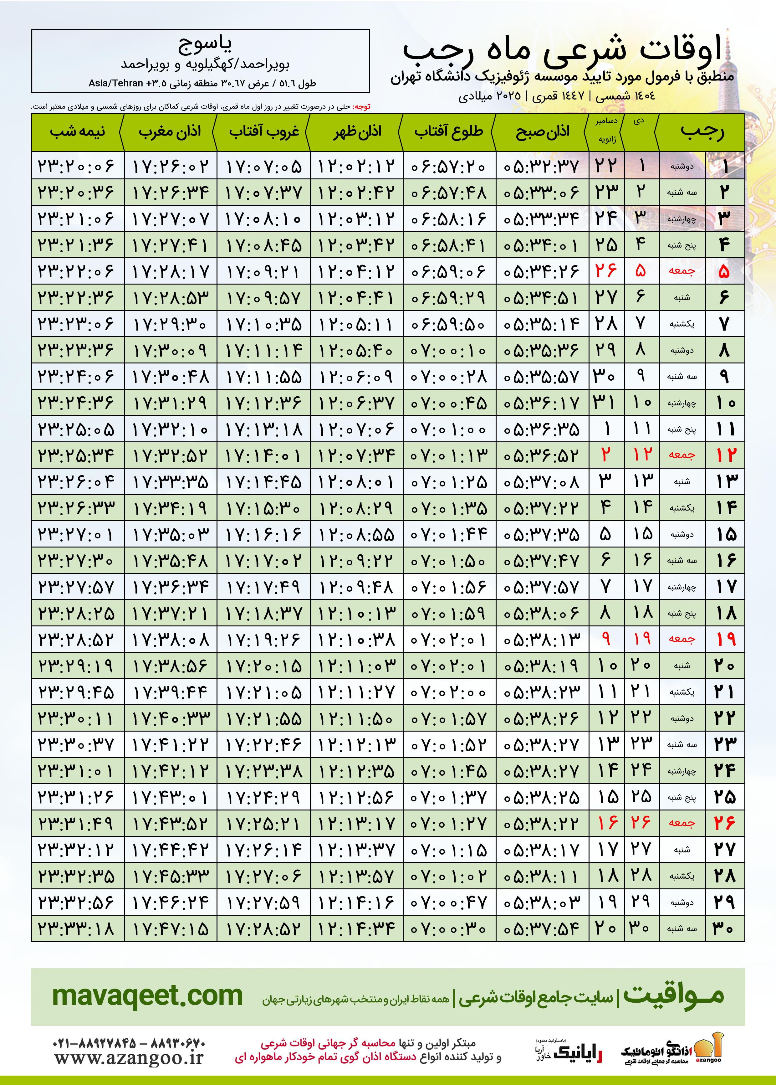 اوقات شرعی ماه رجب ١٤٤٧ هـ.ق شهر یاسوج بر