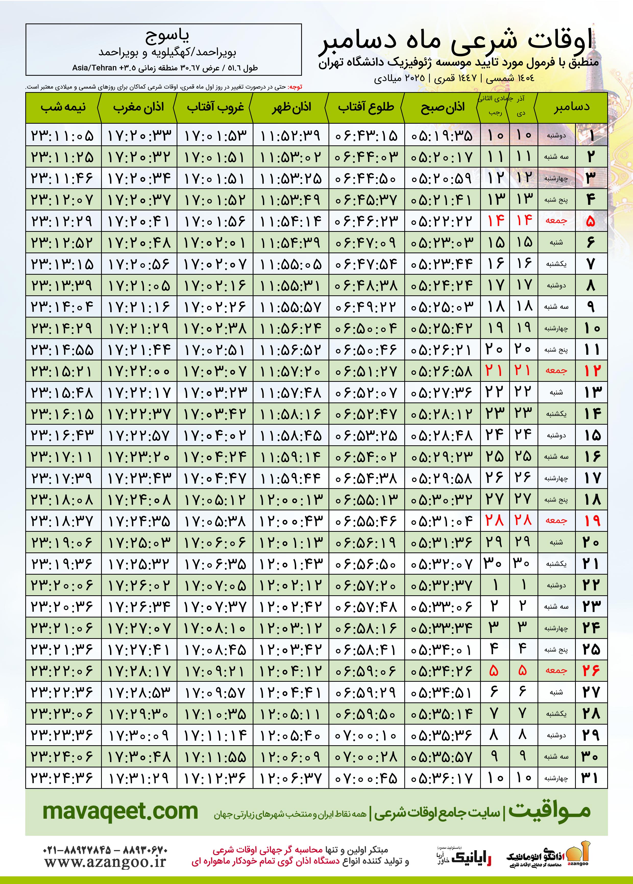 جدول اوقات شرعی دسامبر ٢٠٢٥ میلادی شهر یاسوج