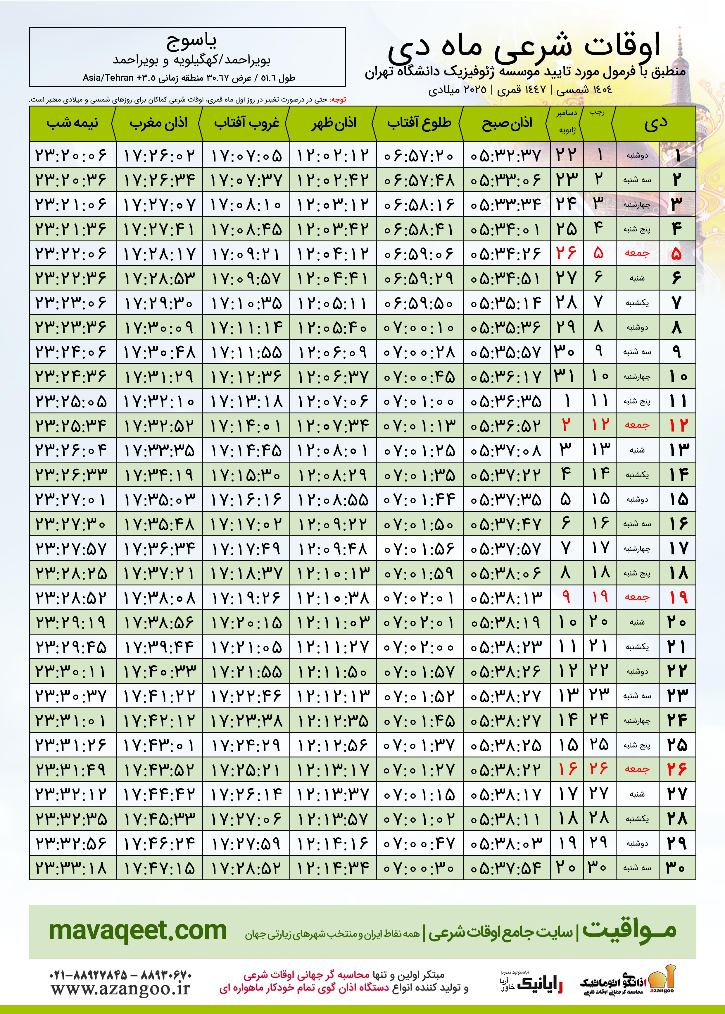 اوقات شرعی دی ١٤٠٤ شمسی شهر یاسوج