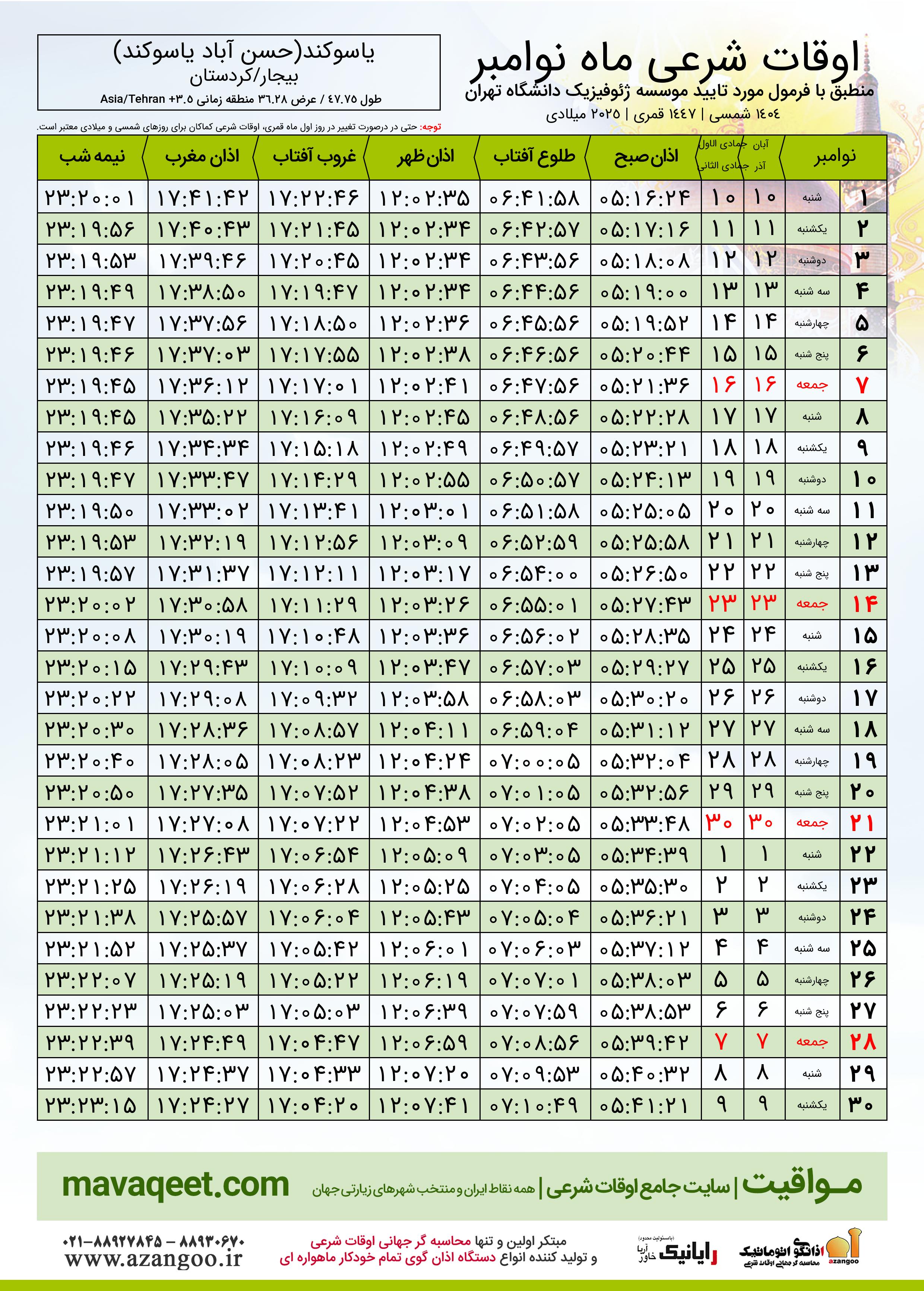 دانلود اوقات شرعی نوامبر ٢٠٢٥ شهر یاسوکند(حسن آباد یاسوکند)